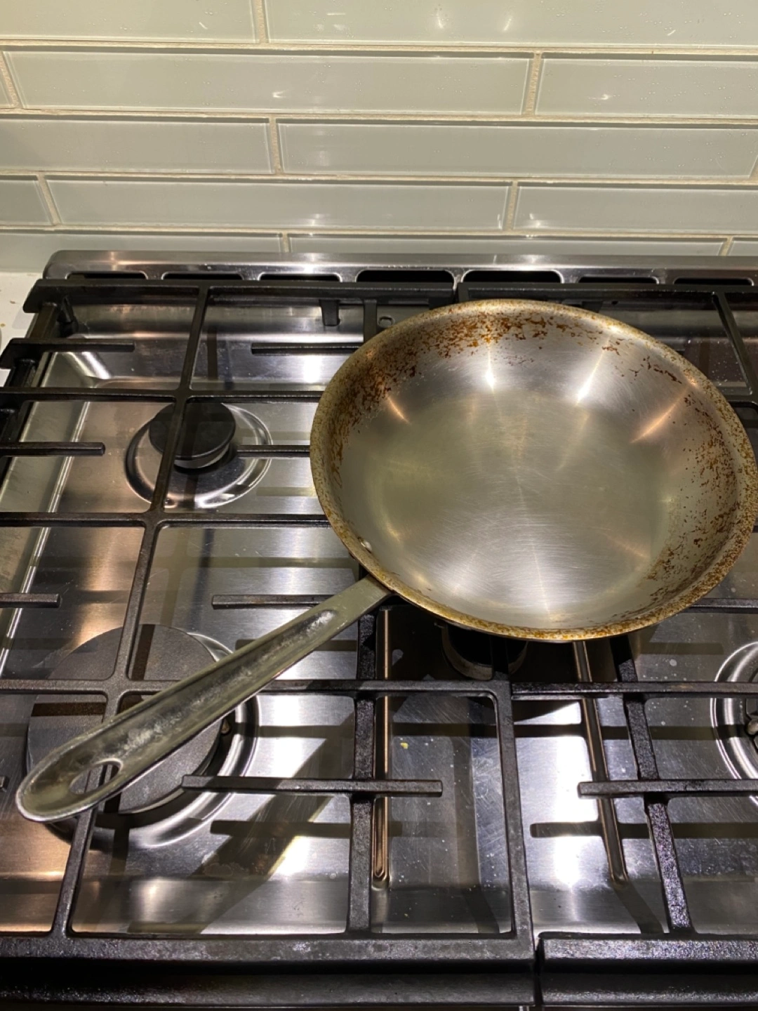Stainless steel frying pan. Used but in good condition. Needs a bit of Barkeeper's friend and some elbow grease to make it look brand new.