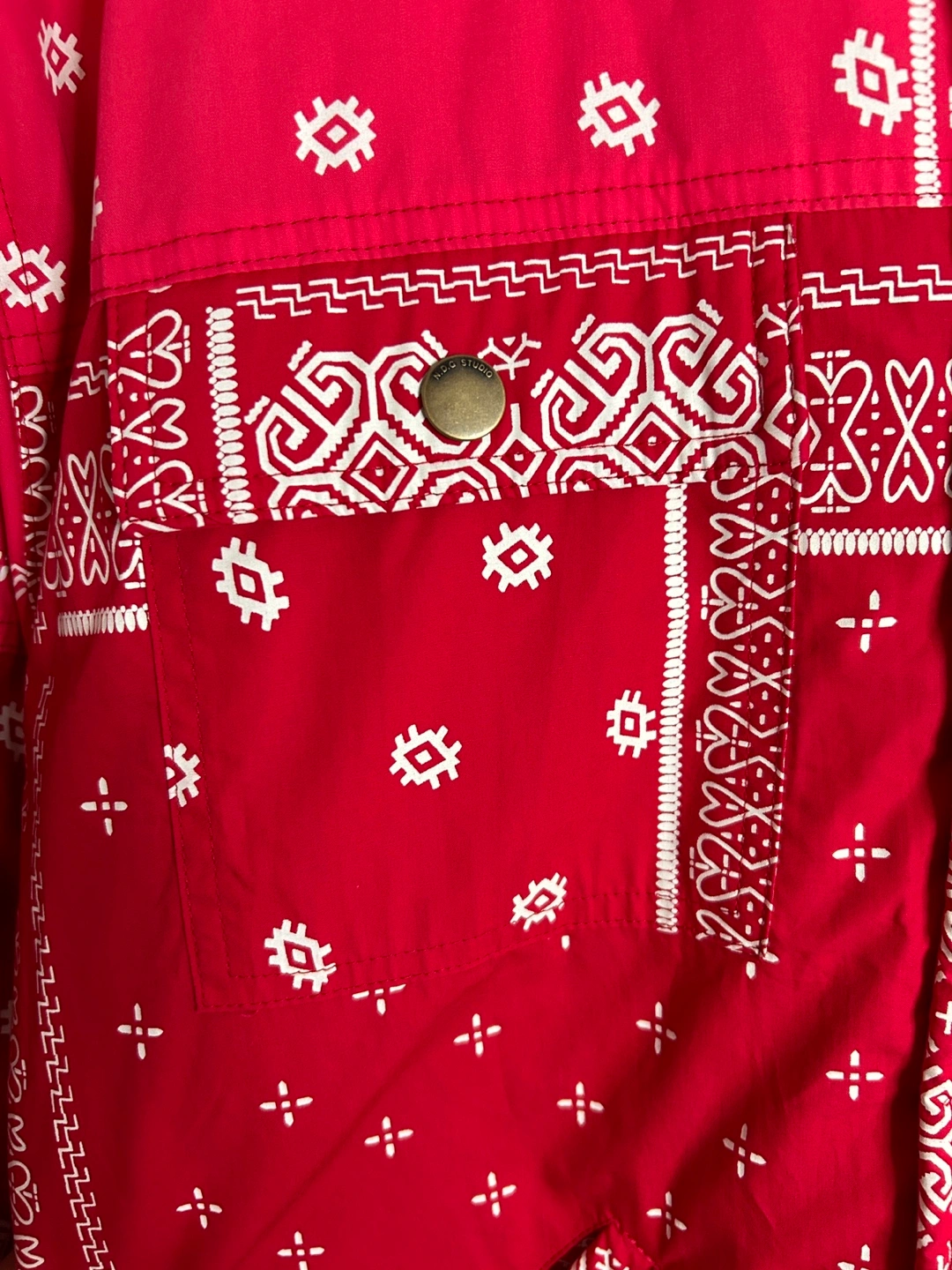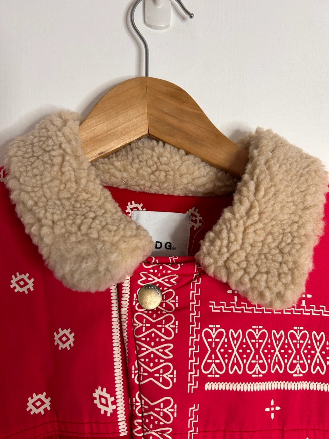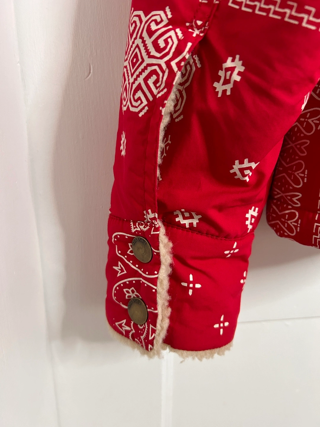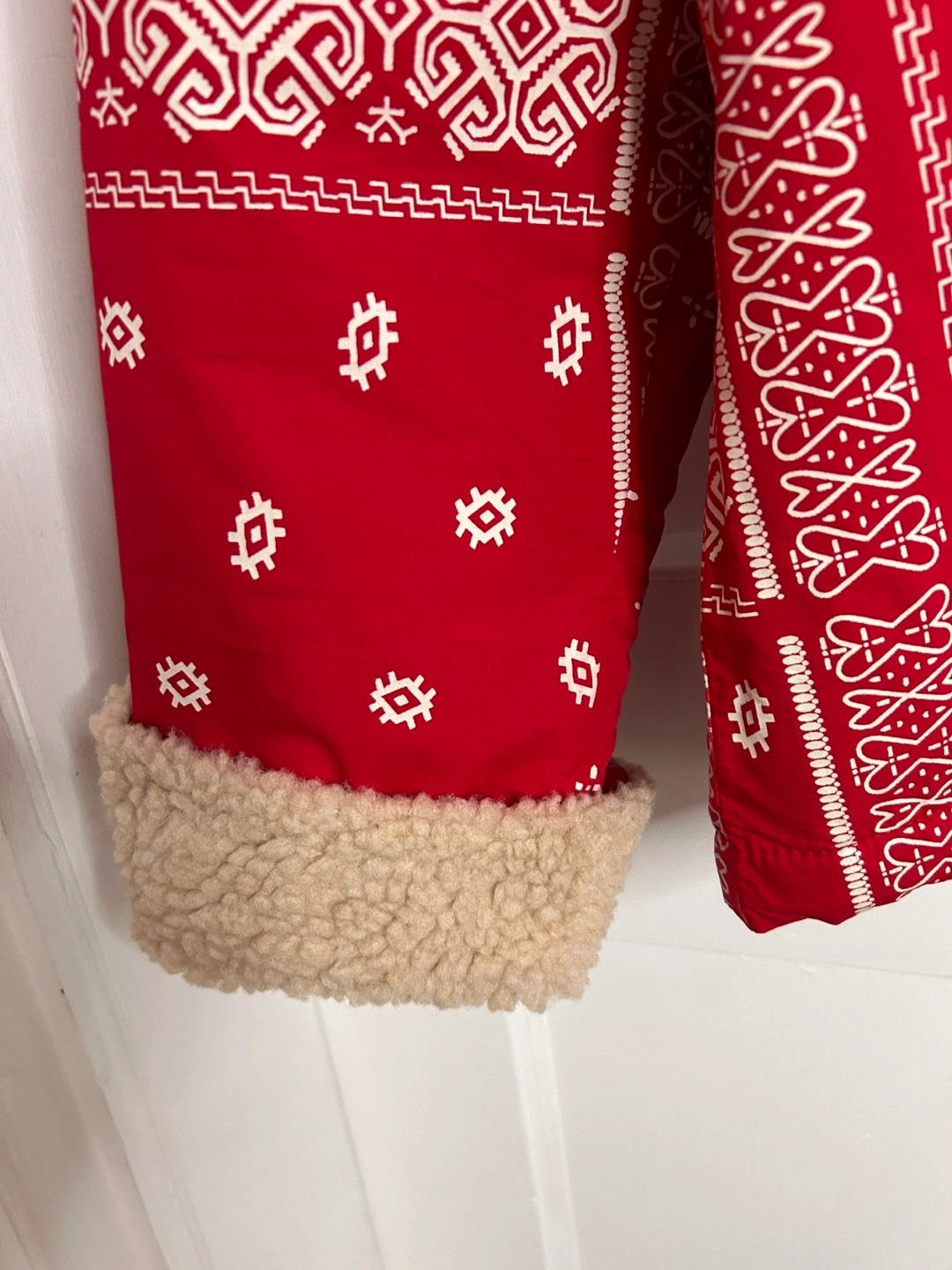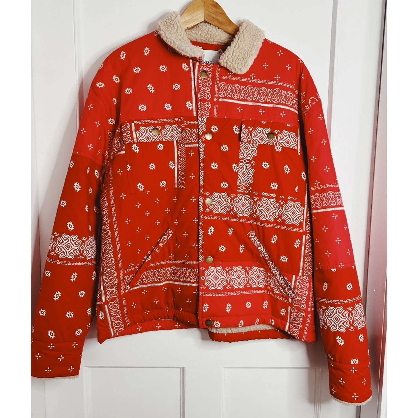 Red bandana print jacket with a sherpa collar and lining. Size large. Made in France and retails for over $300.