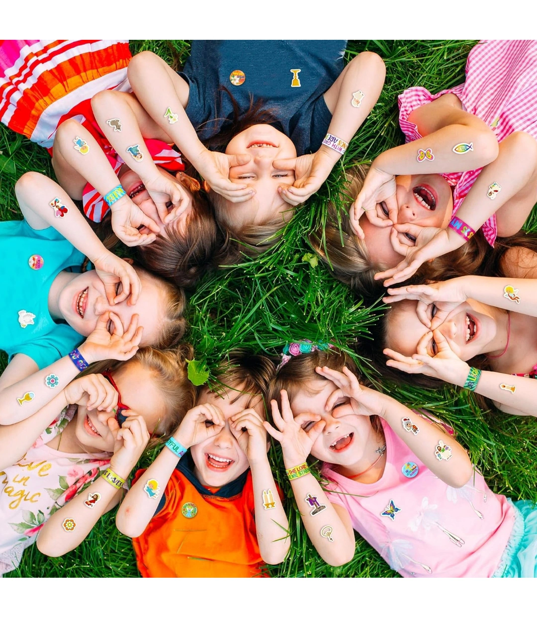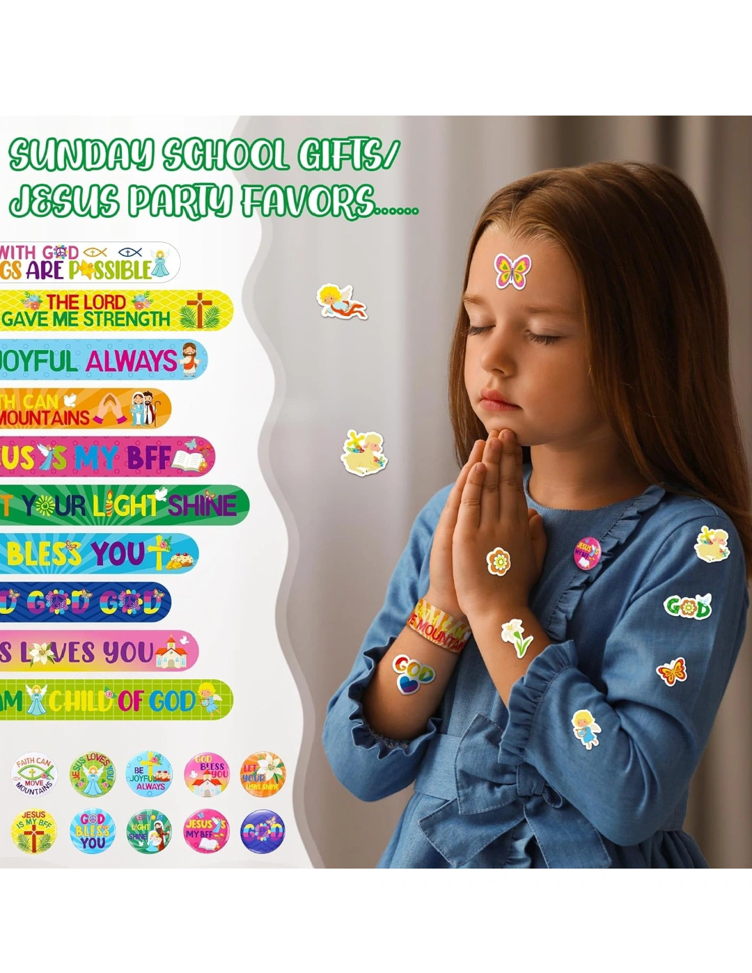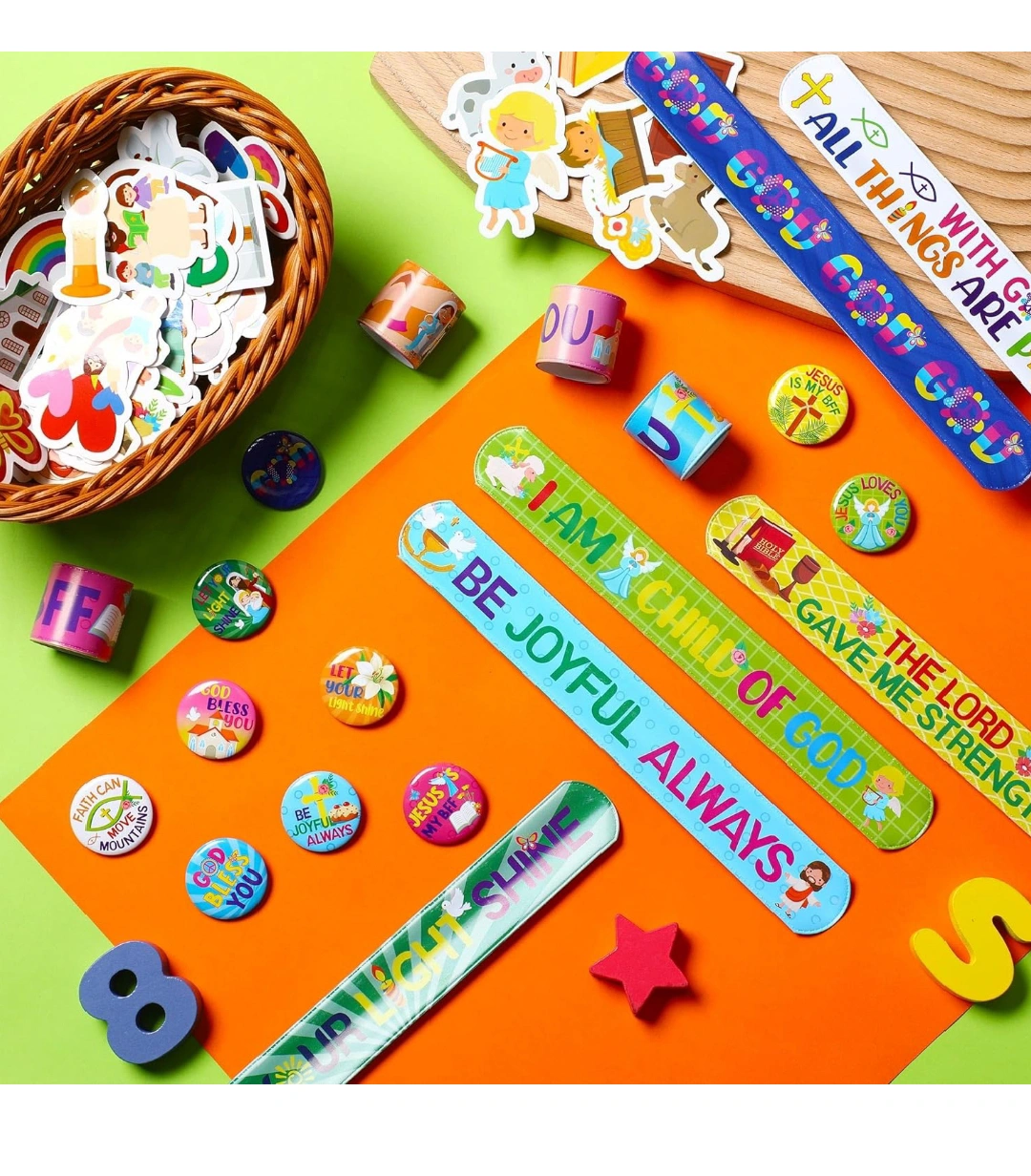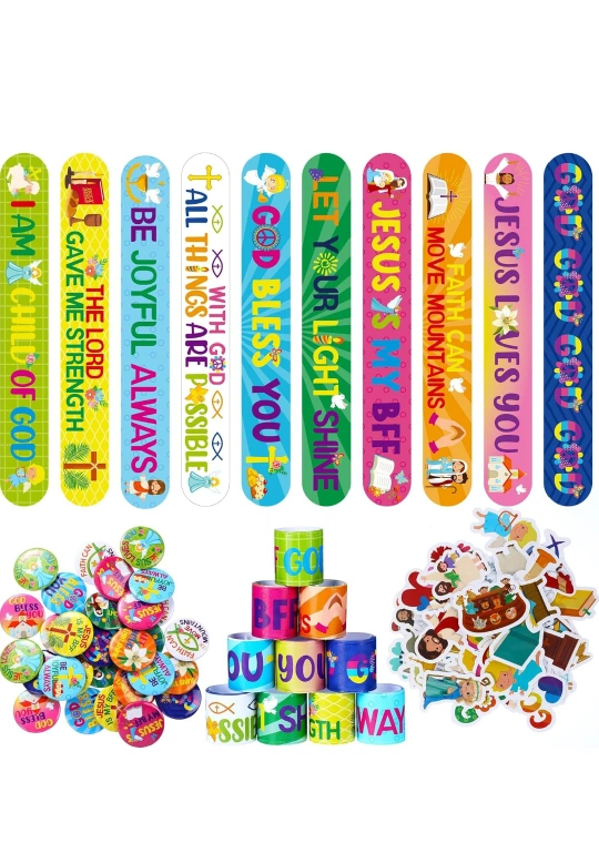 Frienda 120 Pcs Christian Gifts Bulk Religious Slap Bracelets Bible Verse Stickers Jesus Loves You Button Pins Inspirational Prizes for Boys Girls Students Sunday School Party Favor Supplies(Stylish).
