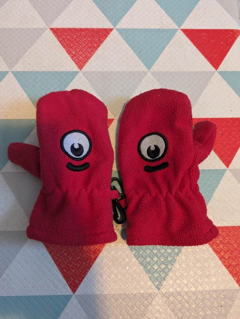 Red fleece mittens with a black eye design that resembles #1 from Numberblocks. Size LG, 2-4 years. Mittens have a clip to connect them together.