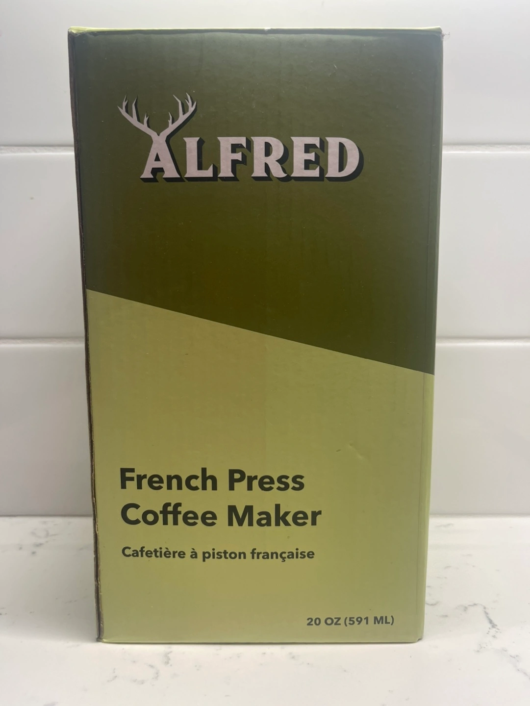 Glass French press coffee maker with stainless steel accents. Includes a lid and a handle.