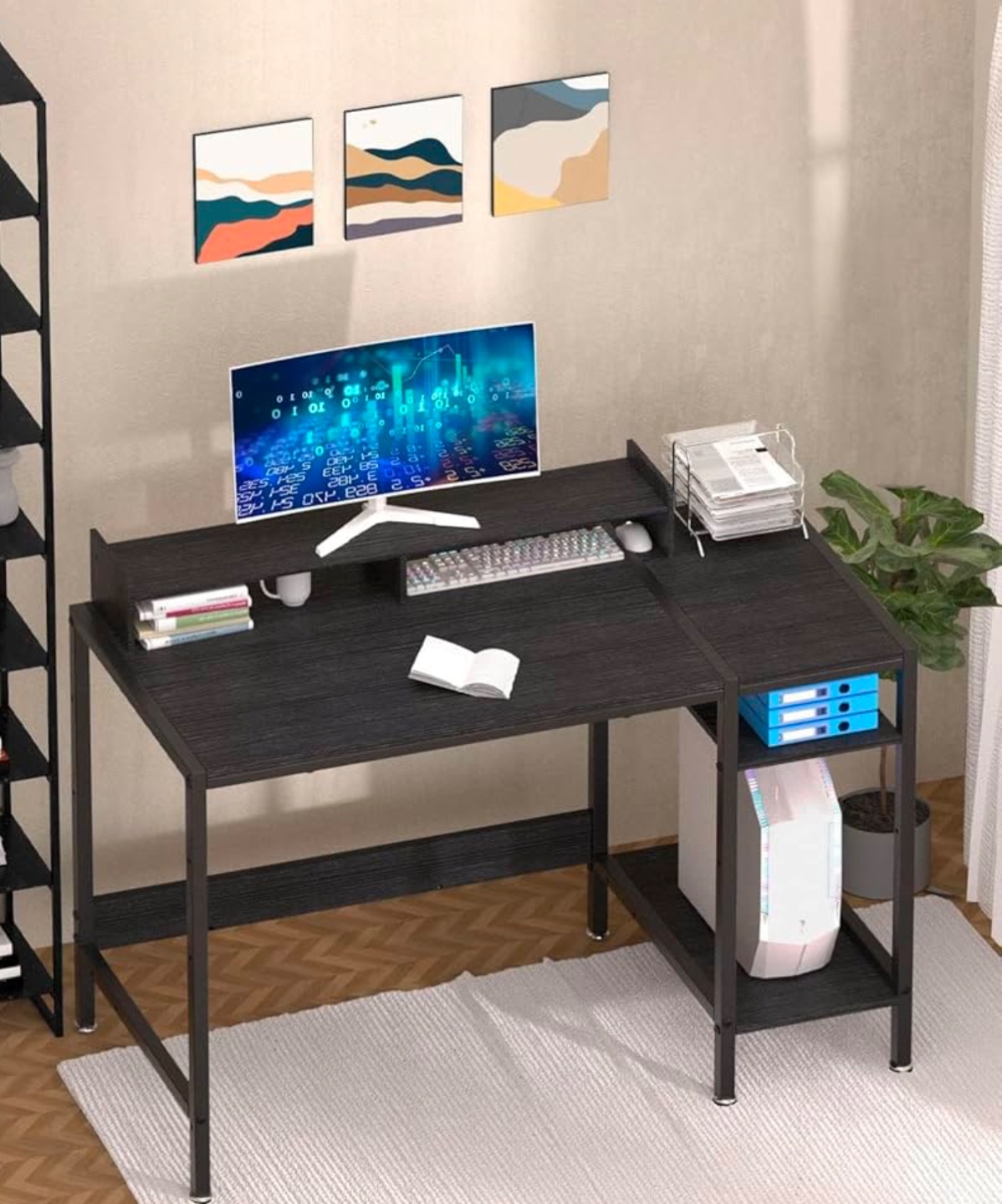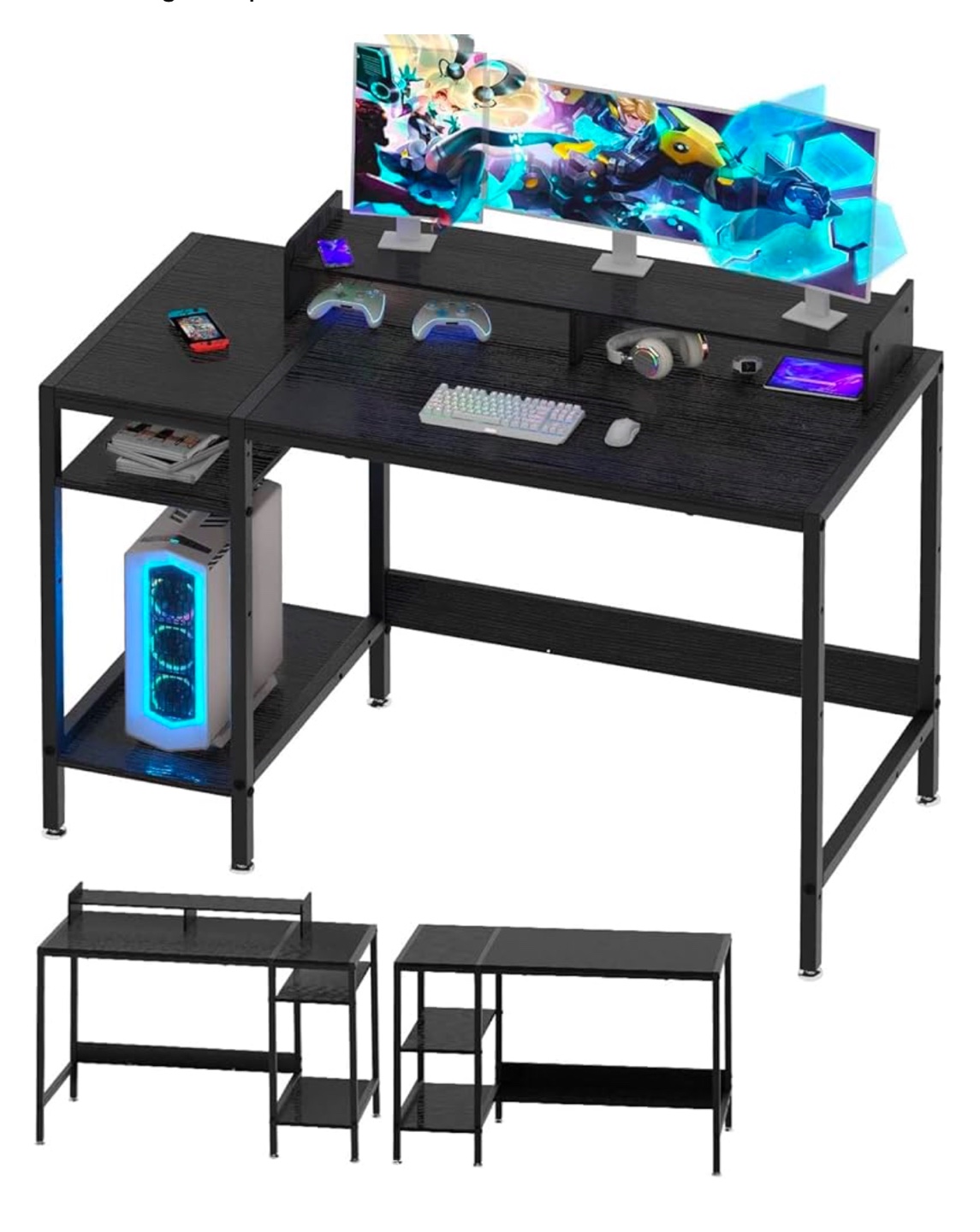 Computer desk with storage shelves and monitor riser. Perfect for gaming, home office, or even a vanity. Shelf can be disassembled and moved to either side.