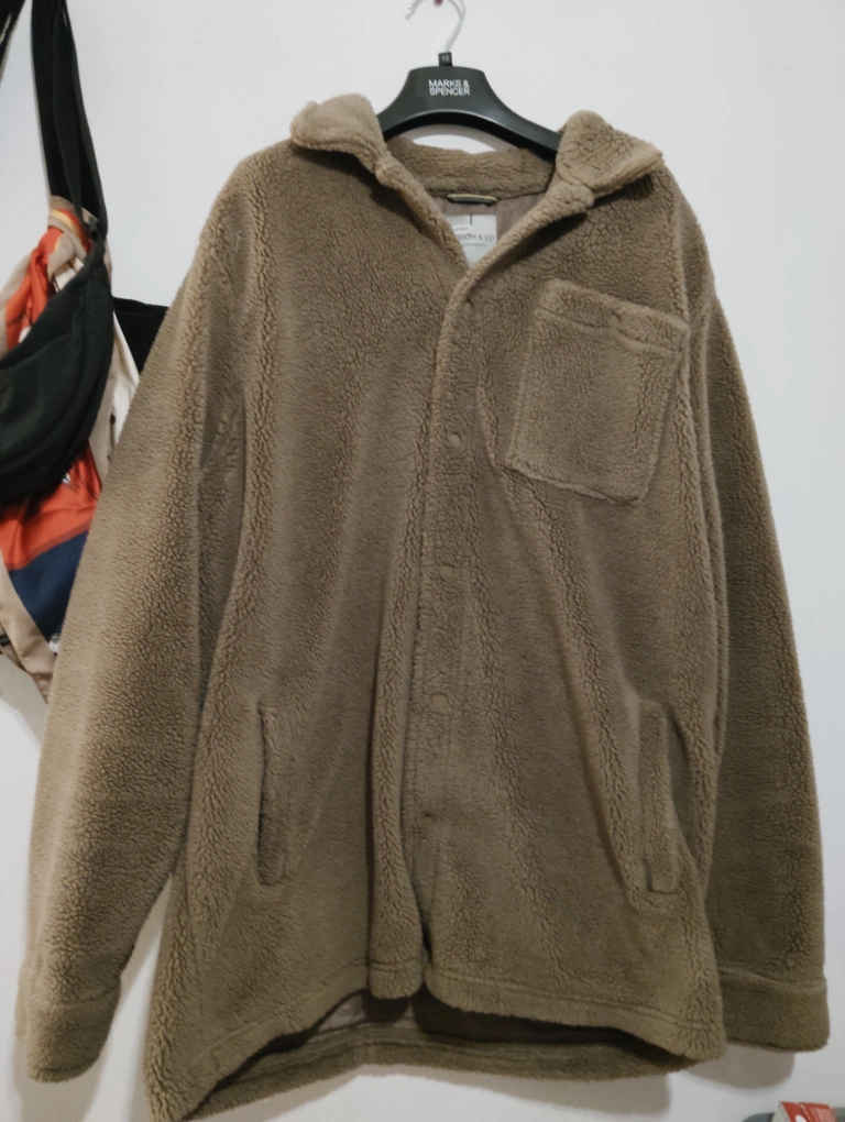 Brown fleece jacket with a snap closure and a patch pocket. doesn't include the hood (sorry I'm a bad photographer) 100% Polyester