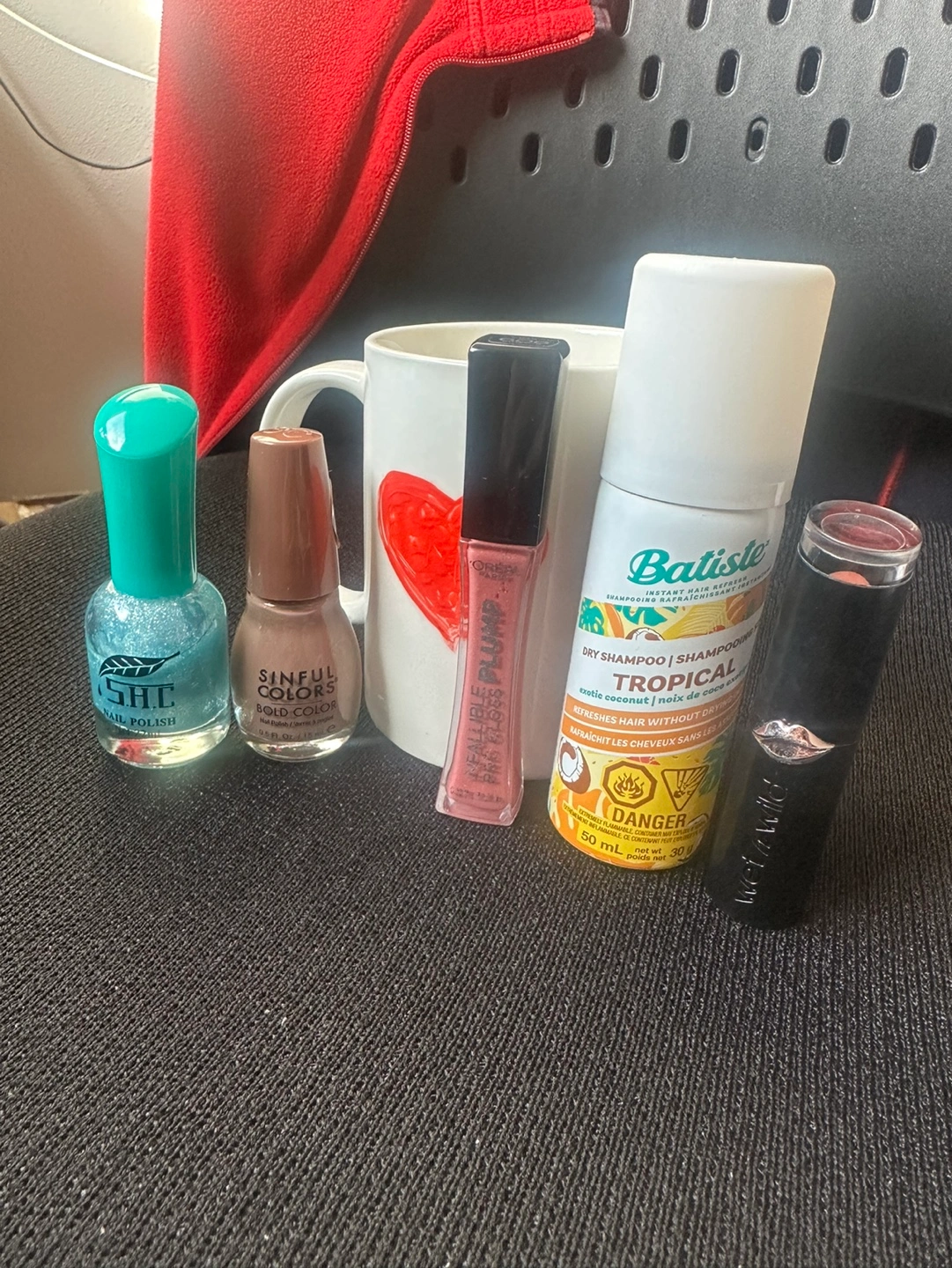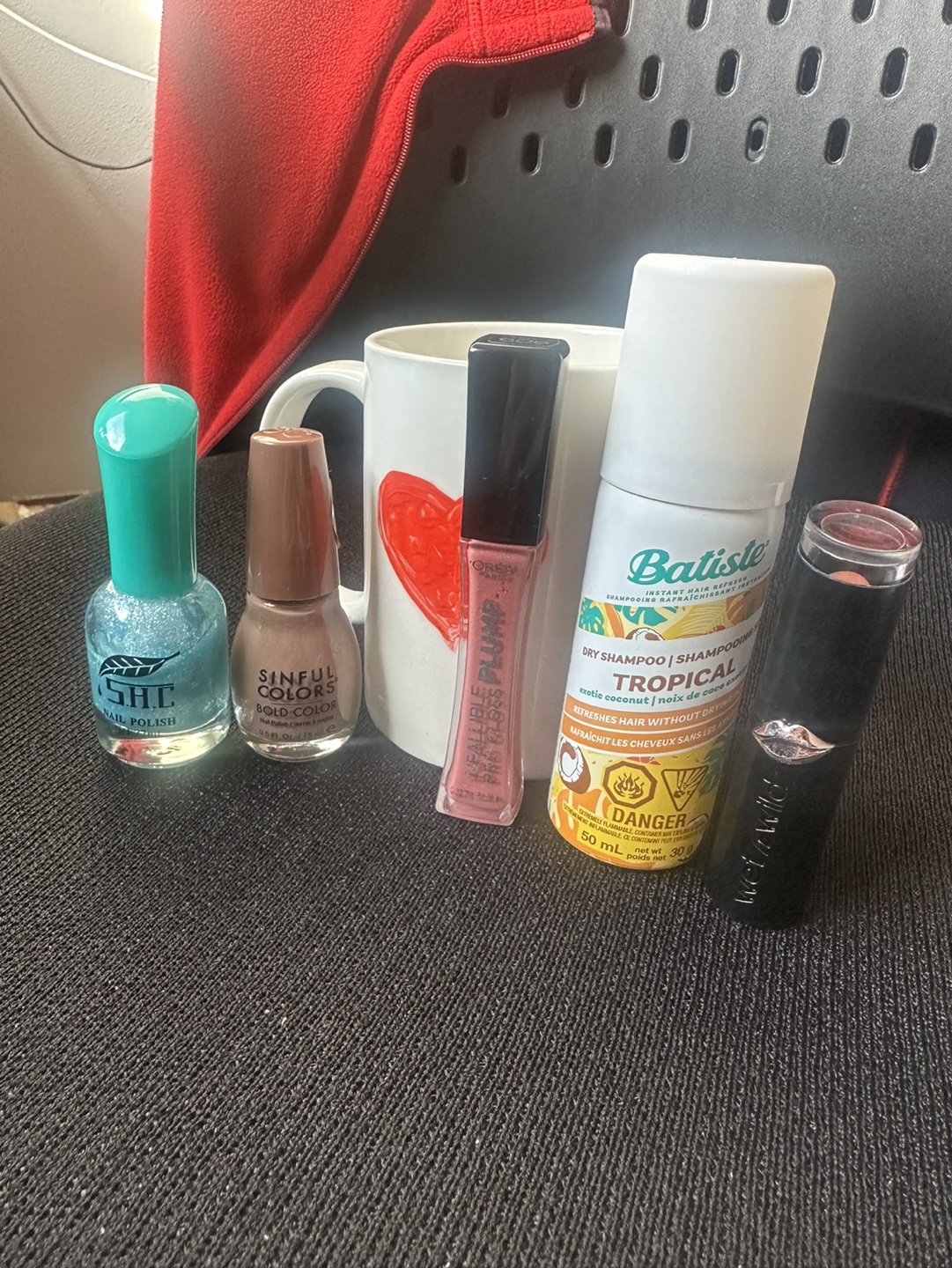 Nail polish, lipstick, dry shampoo, and lip gloss. With an additional mug. Dry shampoo unopened!