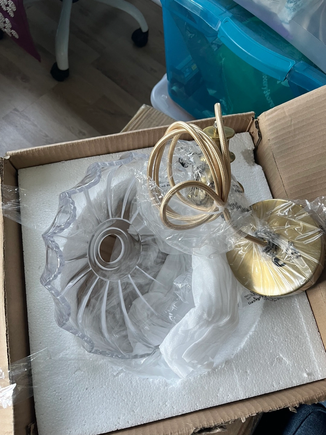 New, never used. Gold pendant light with clear glass shade. It doesn’t fit the light arrangement i have, brand new never used please send u r offers i paid full price. Retail 189+tax from wayfair