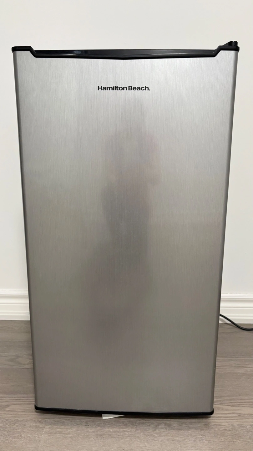 Compact mini fridge, stainless steel finish. Small, ideal for dorm rooms or offices. Features adjustable shelves and door bins. Excellent condition.