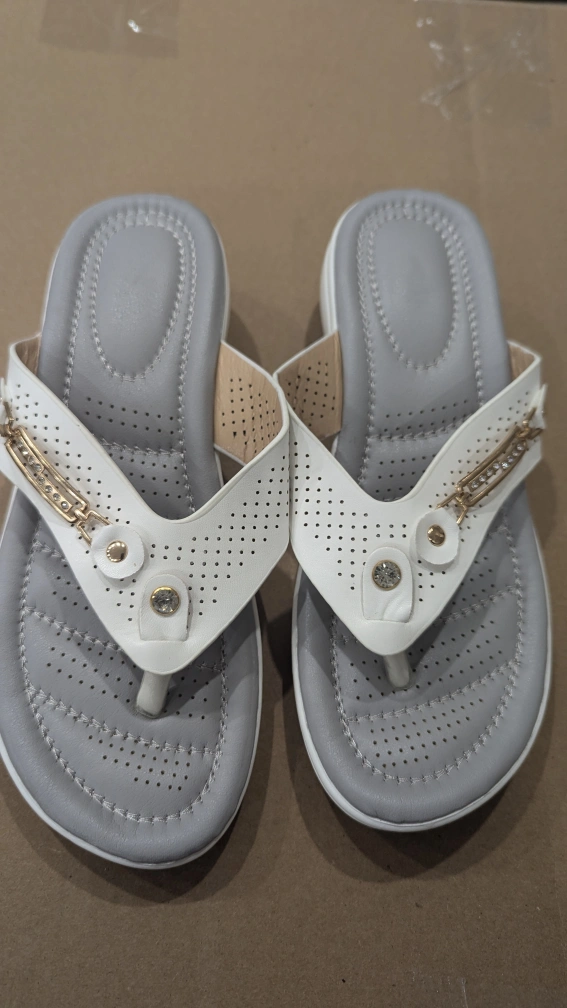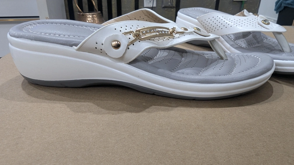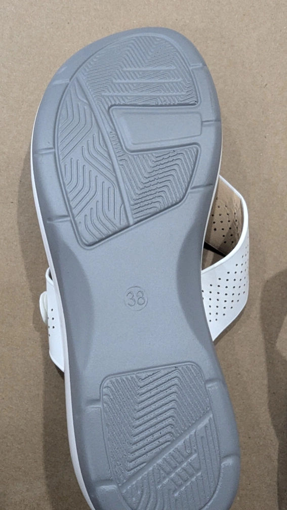 White platform sandals with a gold buckle detail and perforated straps. Grey footbed.