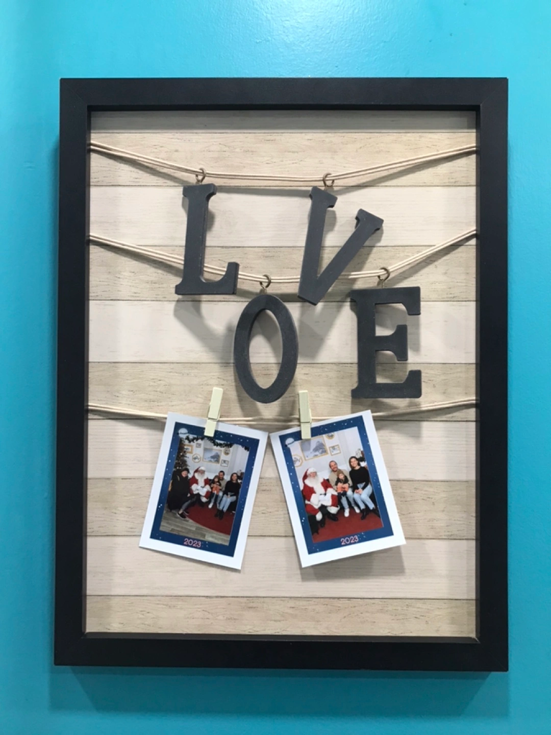 Black framed picture display with the word LOVE displayed on the front. Two pictures are displayed on the front, held by mini clothespins. (Pictures not included)