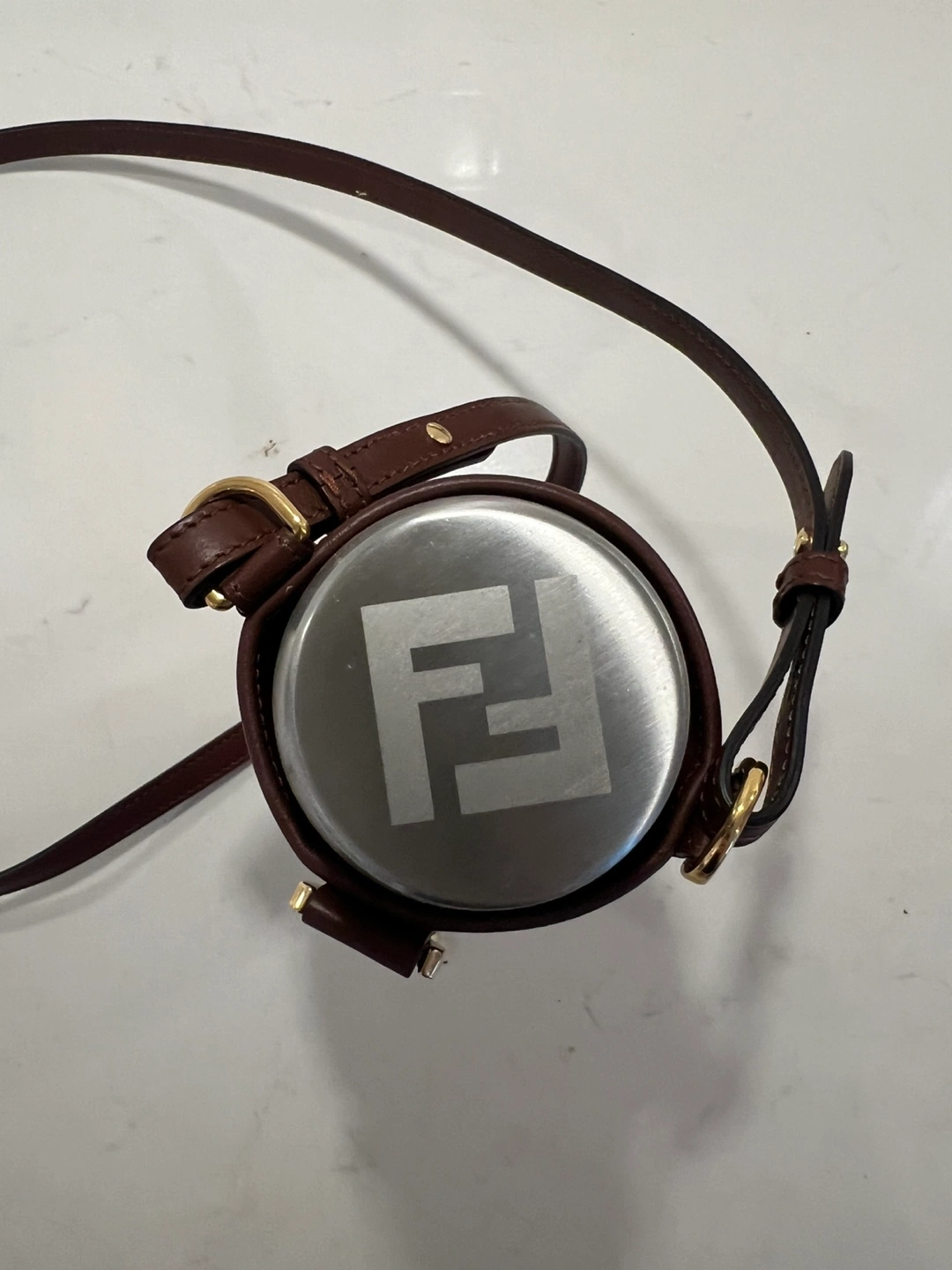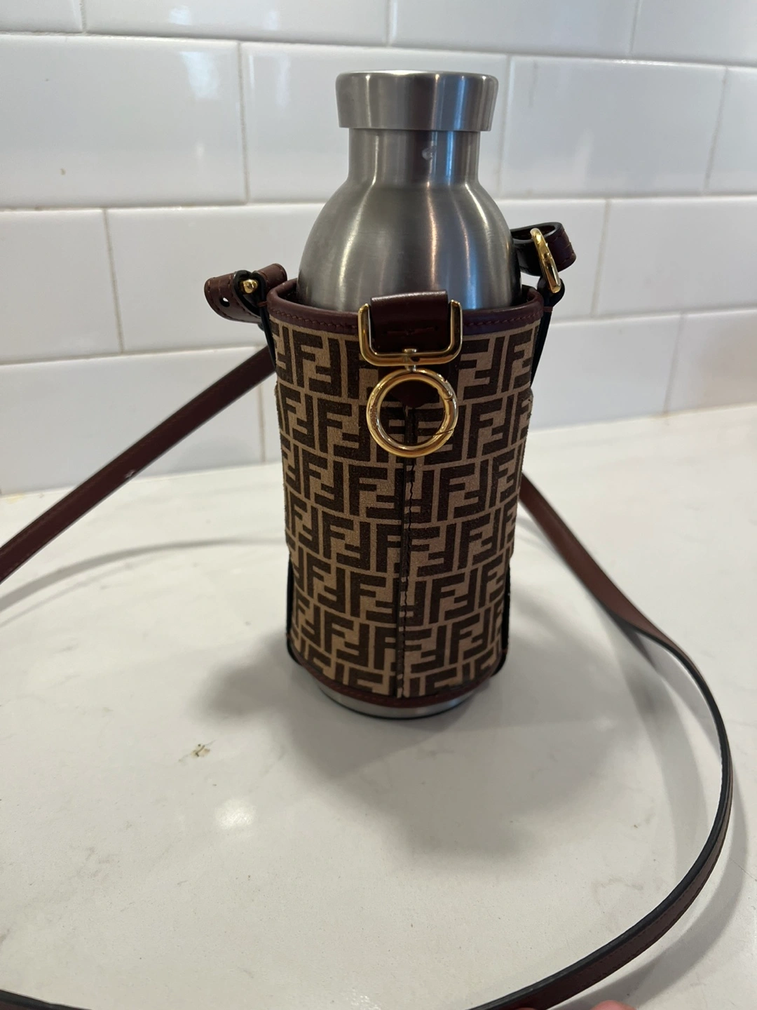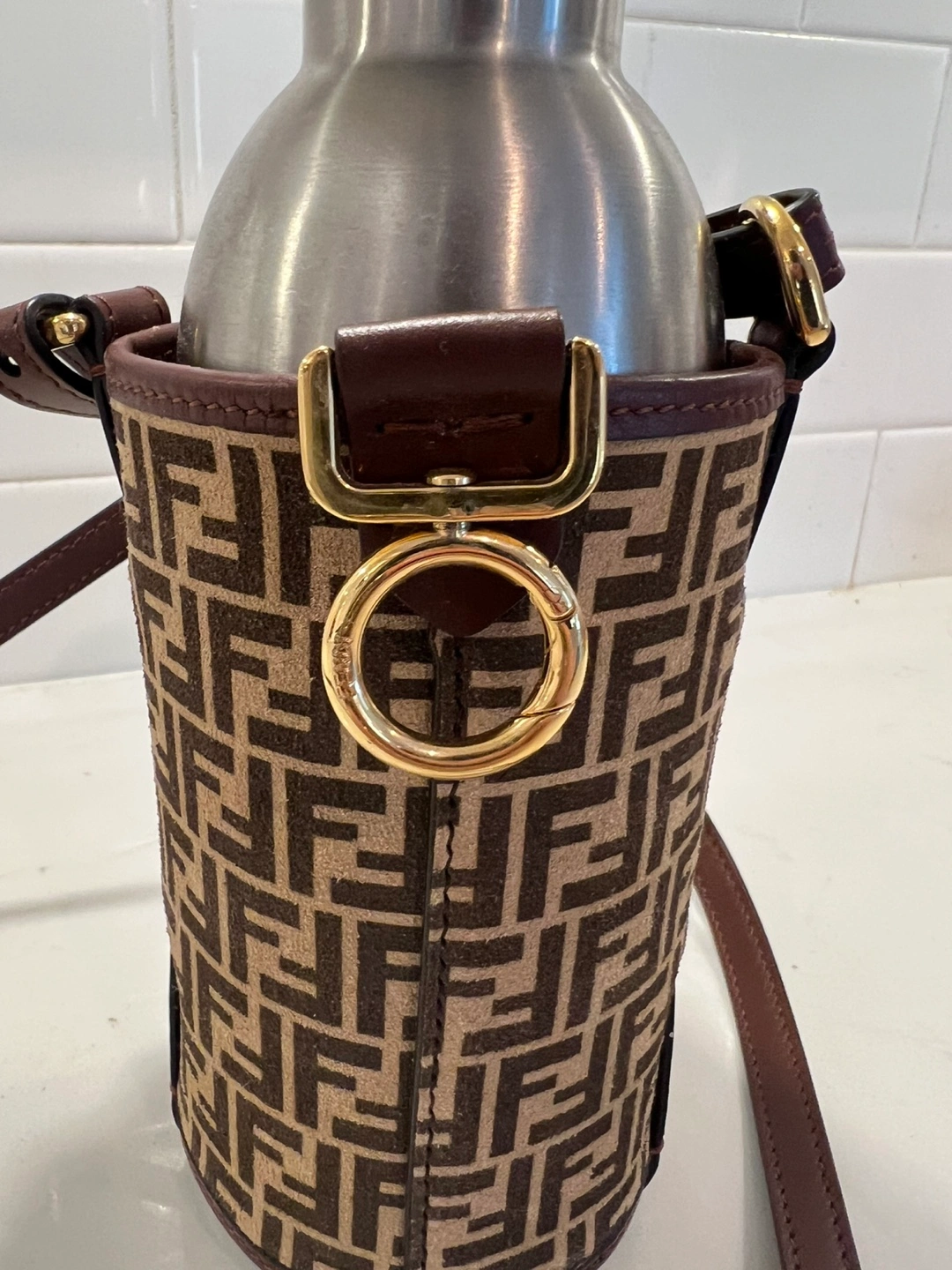 Stainless steel water bottle with Fendi monogrammed sleeve and adjustable shoulder strap. Collab with 24 bottles, bought from Net-a-porter. The part of the bottle carrier you see is in excellent condition but the back where it chafes against the body while walking is slightly scuffed on the suede. It’s not noticeable while in use, it looks perfect.