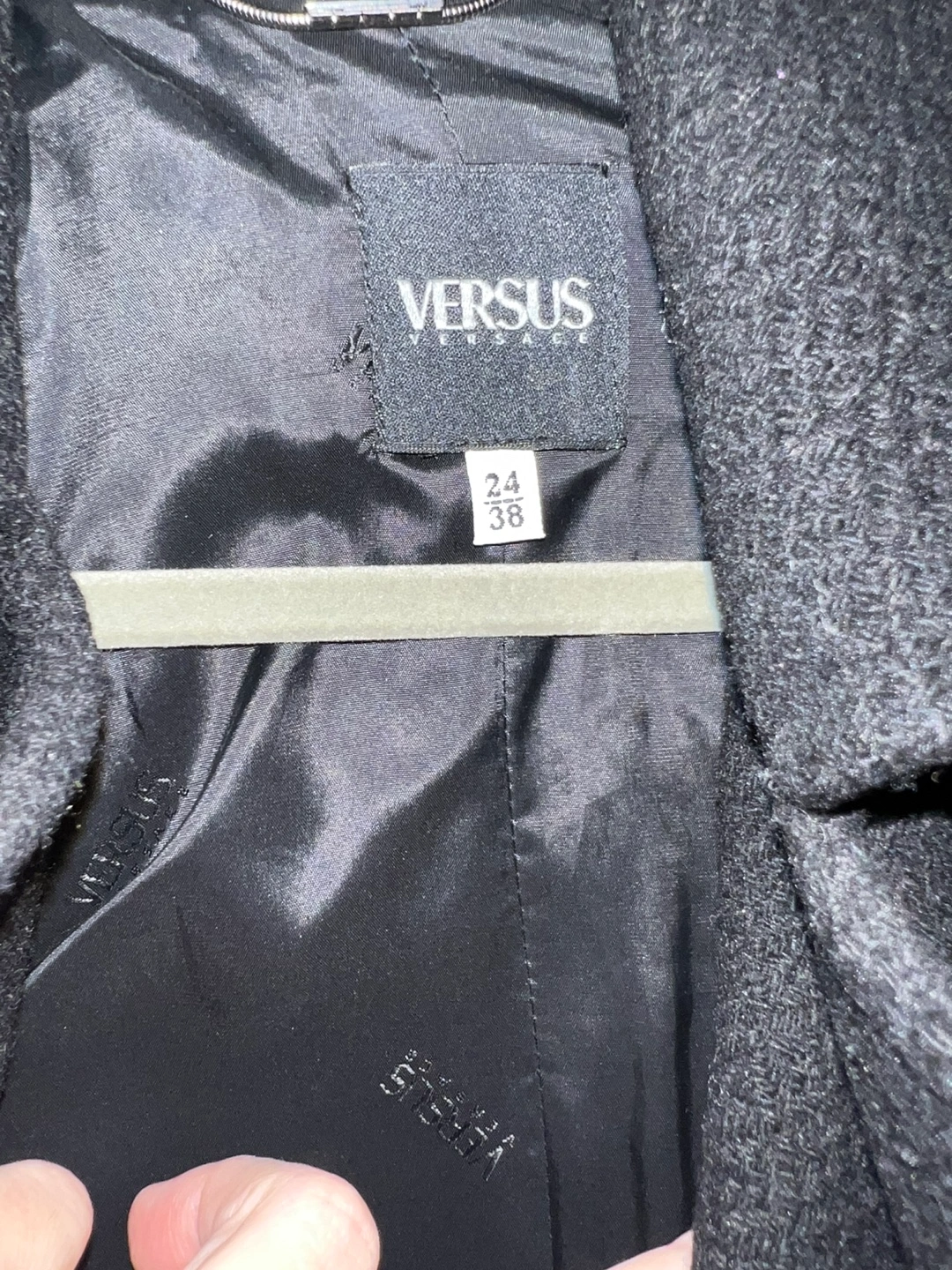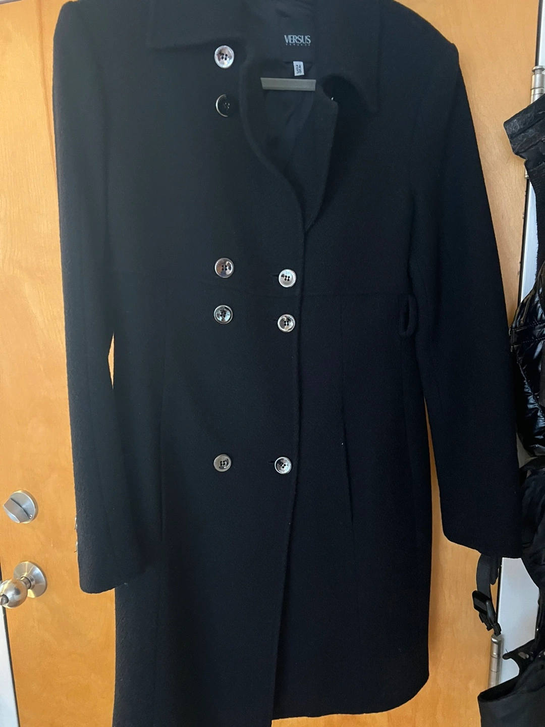 Black double breasted coat with silver buttons. Long sleeves and a fitted waist. Size 38. Missing the belt but it isn’t noticeable or necessary.