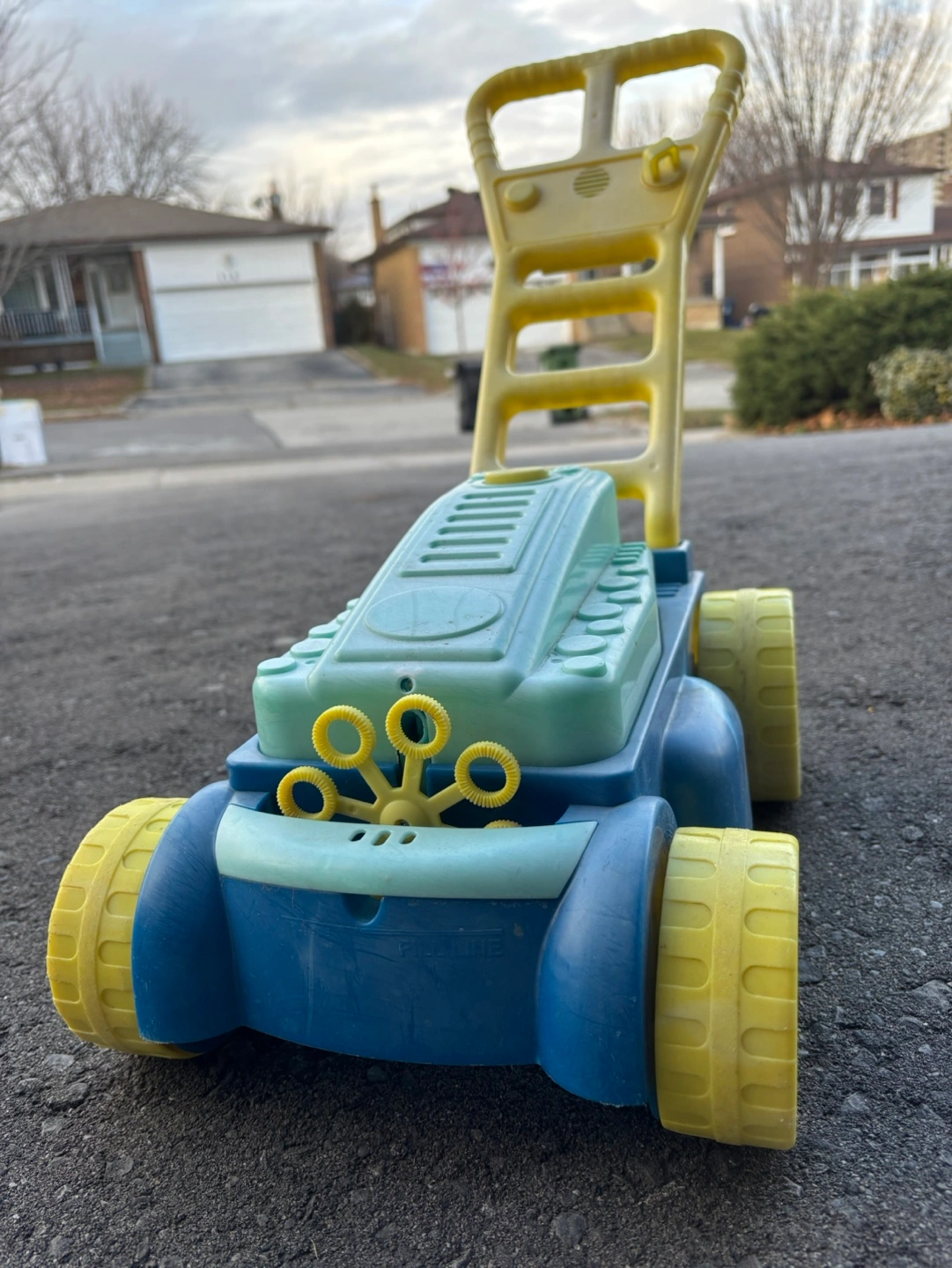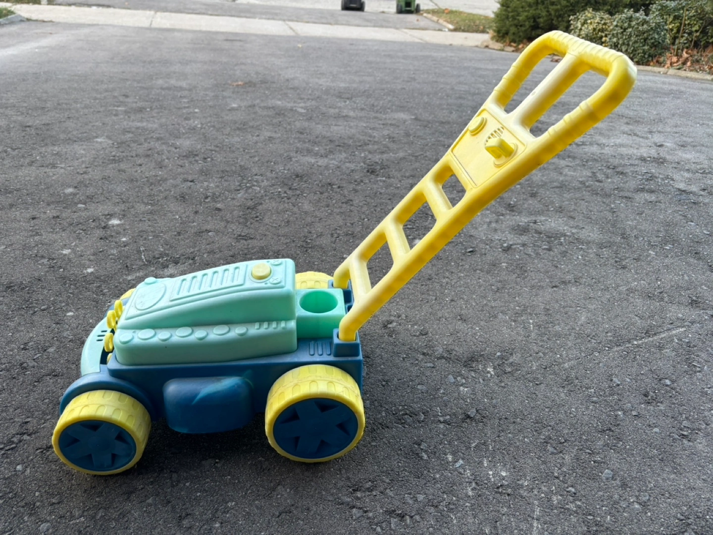 Blue and yellow plastic toy mower that blows bubbles. Has a handle and wheels.