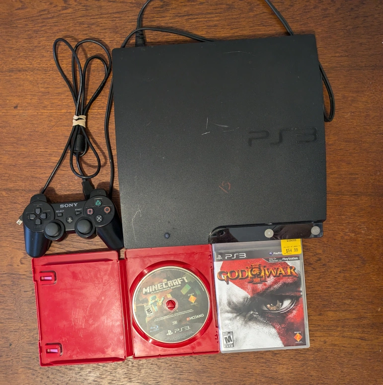 Working PS3 slim console (120gb), one controller, God of War III & Minecraft. Console comes with power cable and controller cable.