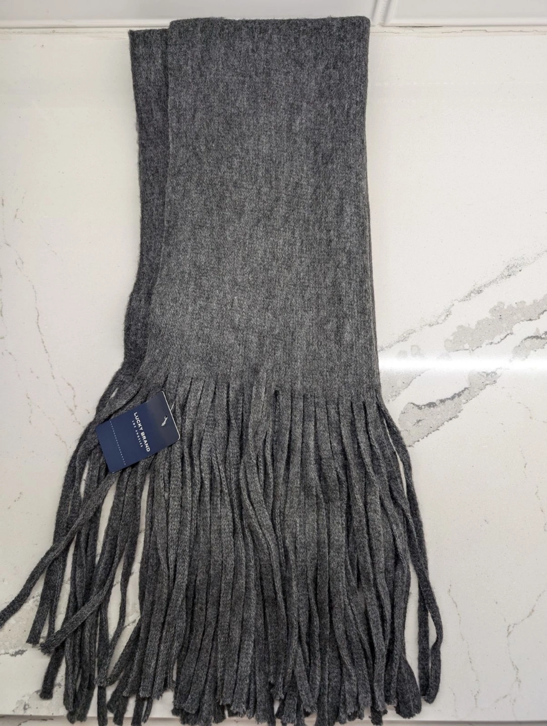 109Grey scarf with fringe. 53% polyester, 47% acrylic.