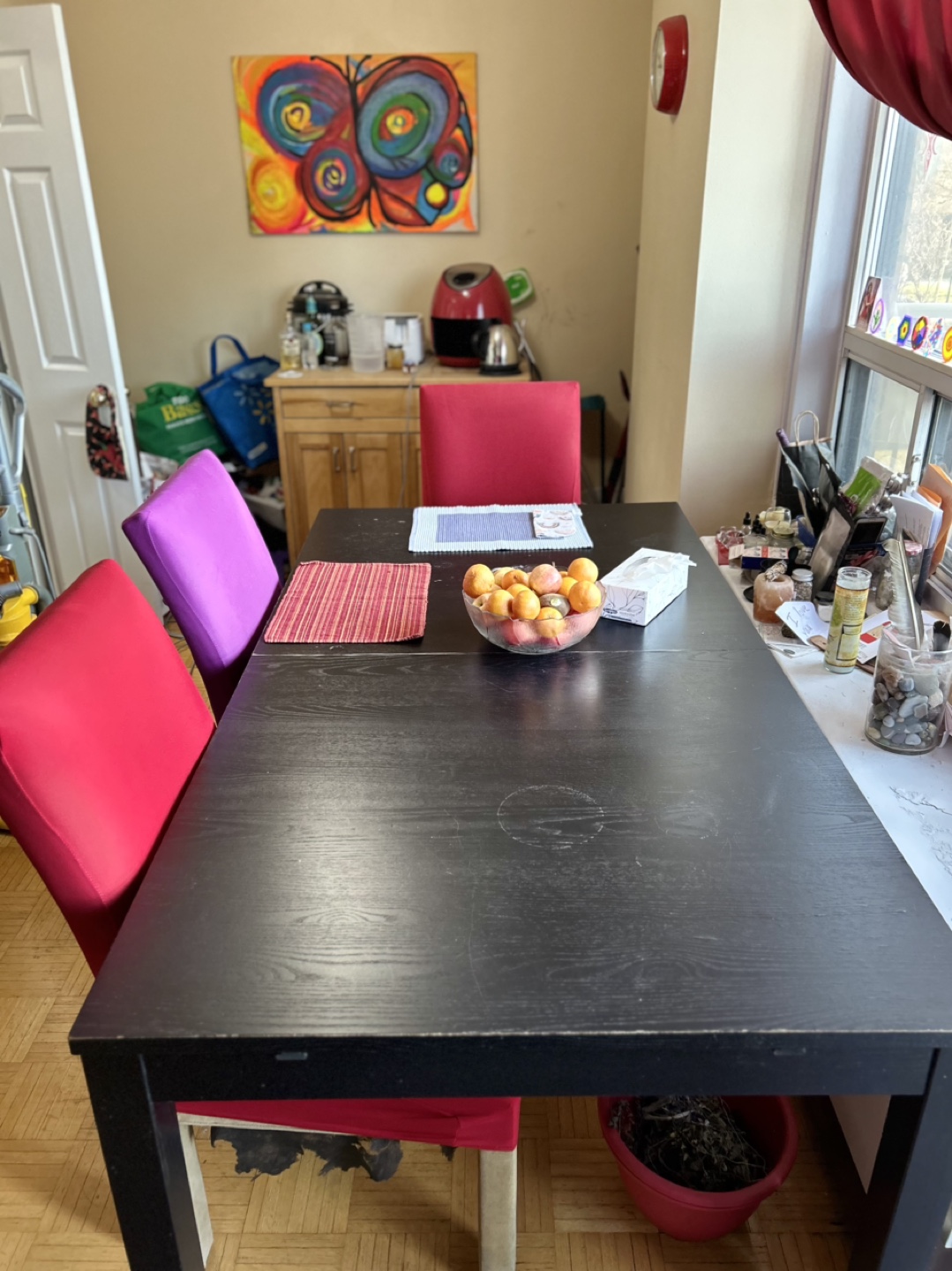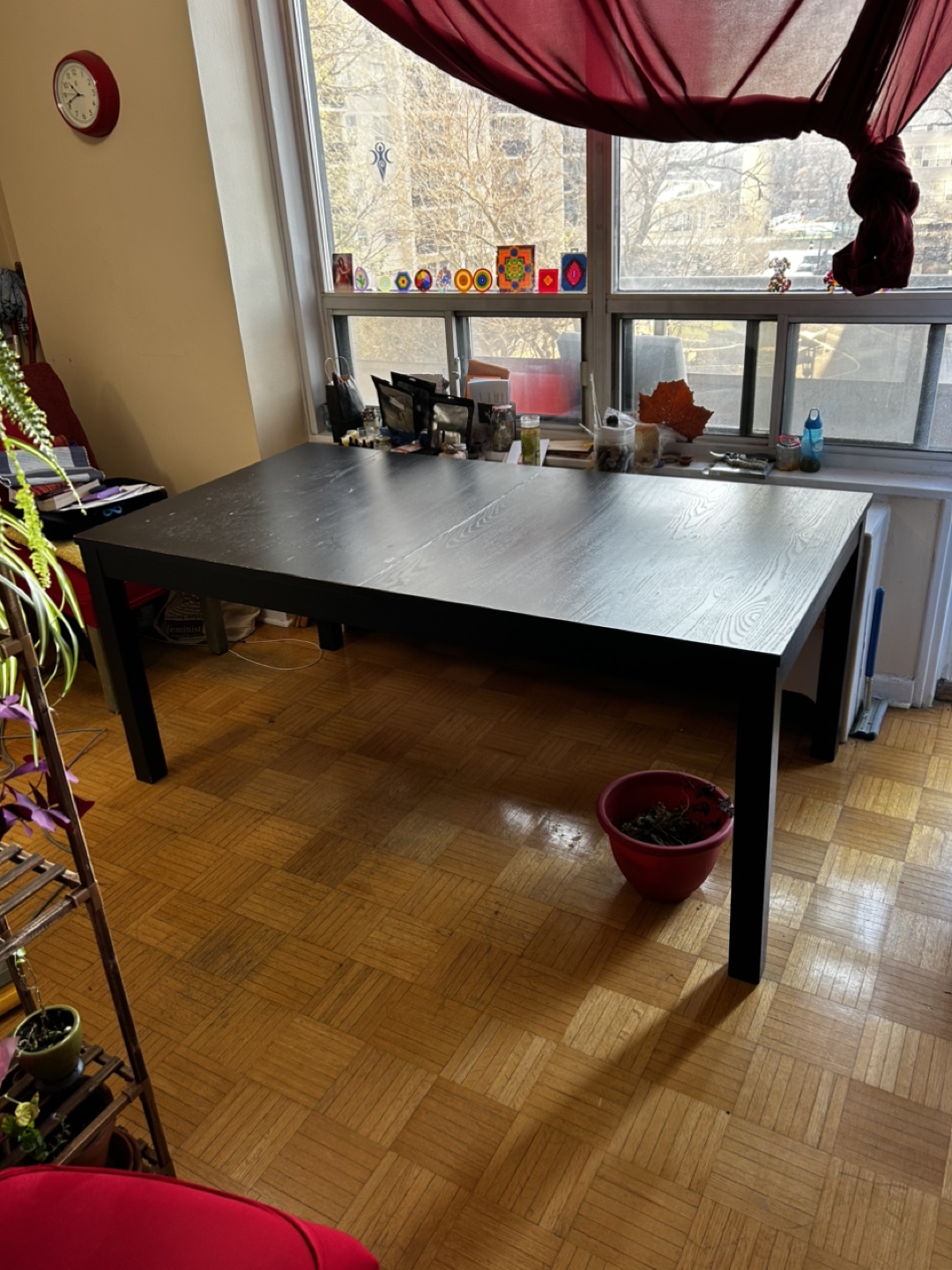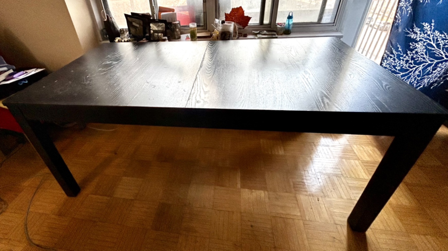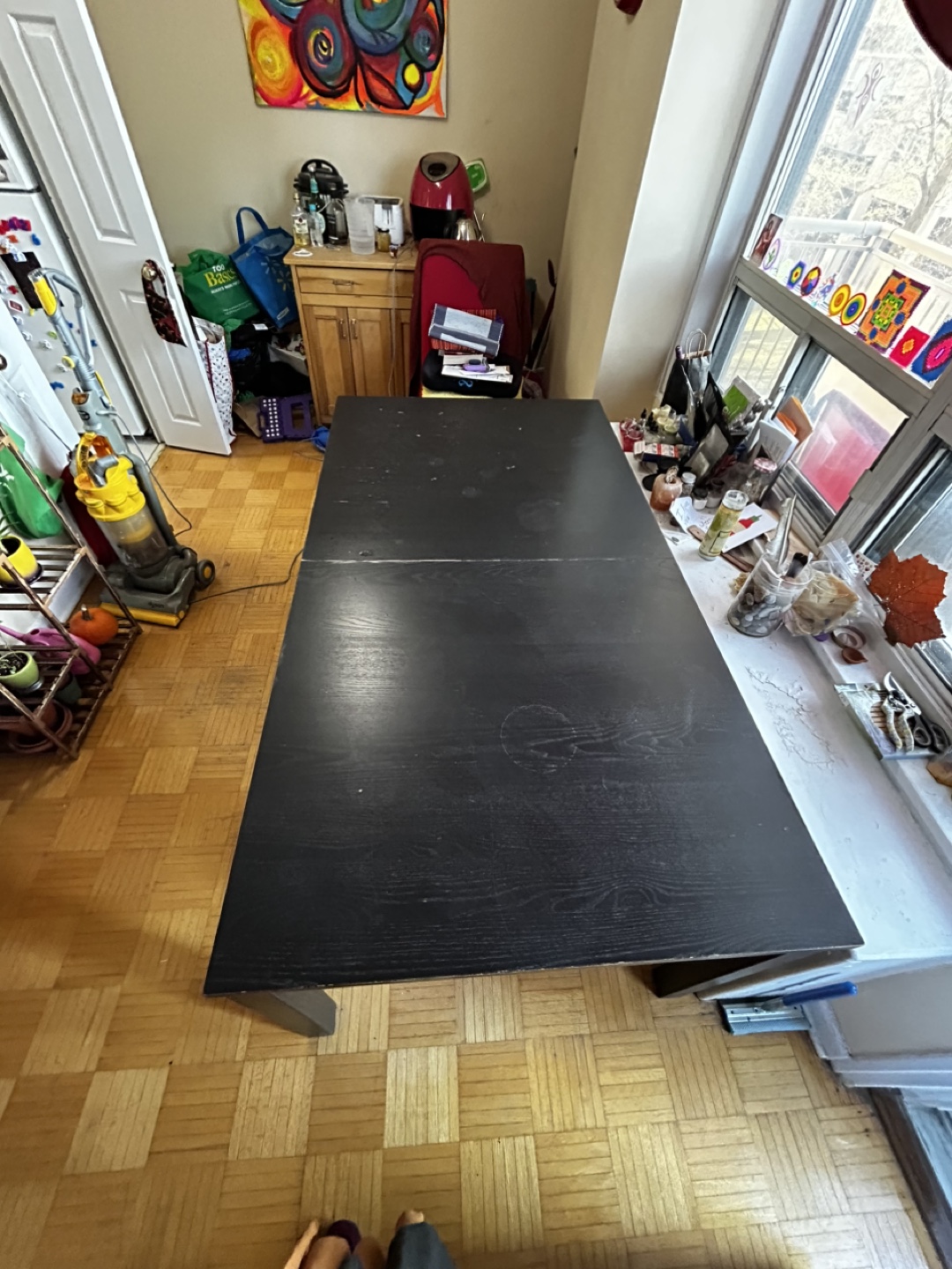 I found the smaller table I need so this one is free to a good home! Fastest pickup preferred! Black extendable dining table. Table is in good used condition with some minor scratches on the top. 25” 65.5cm H to under table Extension: 34.5” or almost 88cm to the split, the leaves are each 16.75” or 42.5cm. Do you have a smaller table you’d like to trade? Seats 8 as is and has 2 leaves to extend and seat at least 12. I’ve hosted a dinner party for 14 with this table. Pick up only. Legs come off but the table is long so you’ll likely need a van for transport. Use the length measurements to double check.