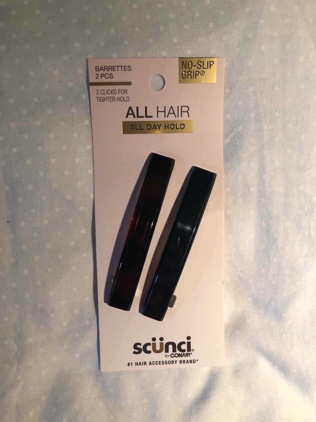 One brown and one black Scunci No-Slip Grip hair barrettes. Three clicks for a tighter hold. All day hold.