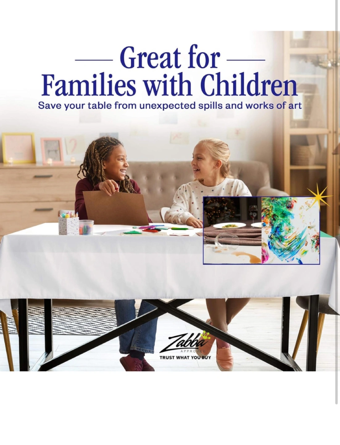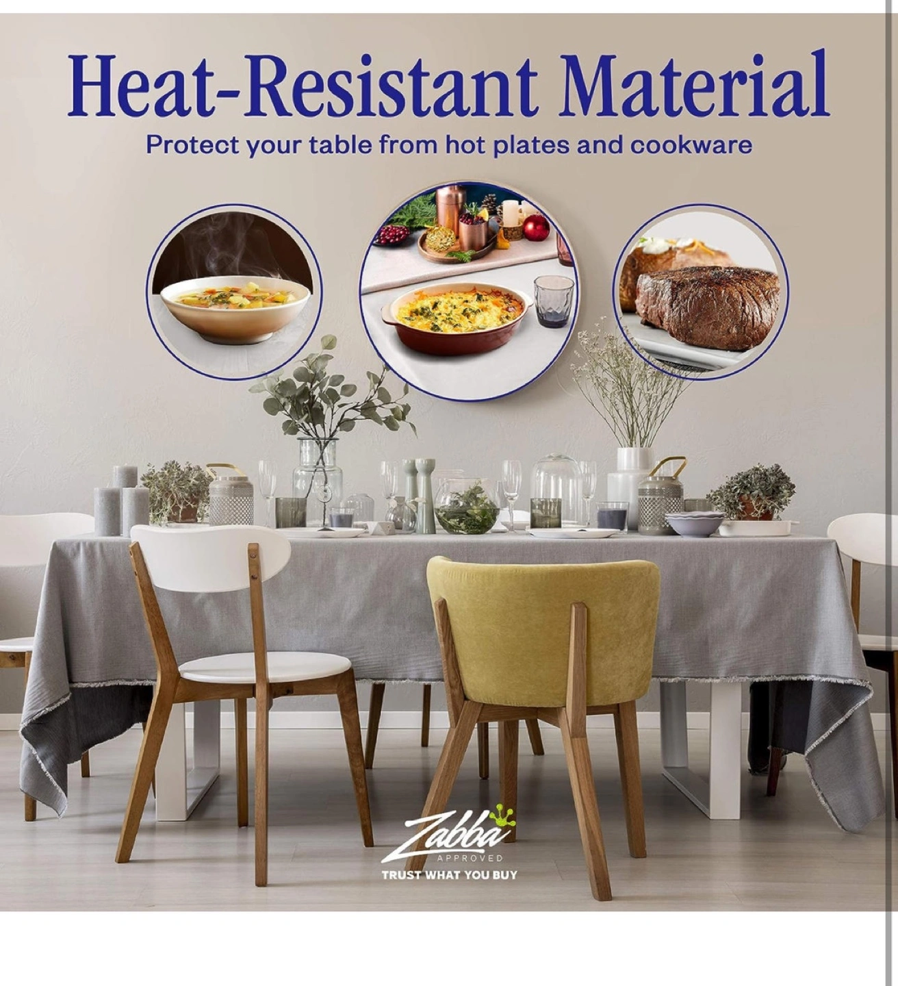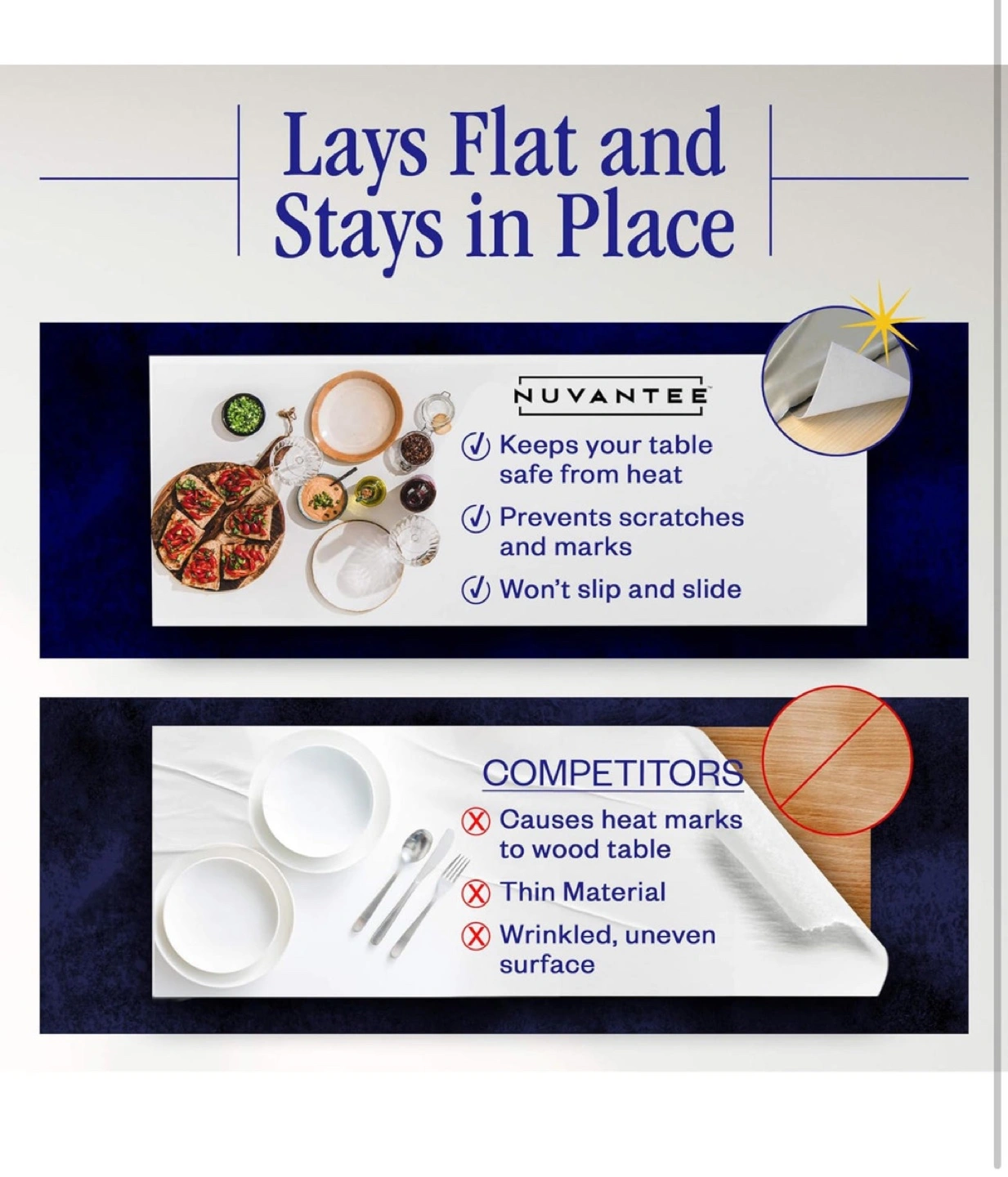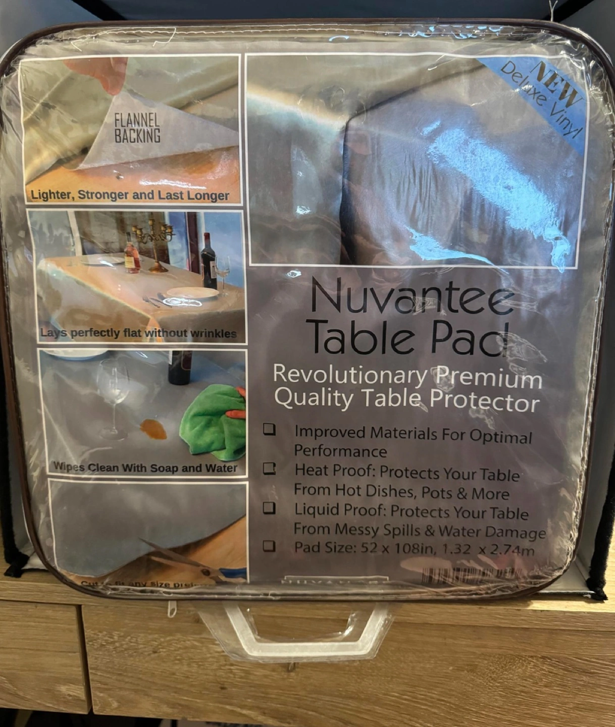 Table protector pad. Heat and water resistant. Fits invisibly under your tablecloth. Improved materials for optimal performance. Protects table from hot dishes, pots, and more. Protects your table from messy spills and water damage. Pad size: 52 x 108 in, 1.32 x 2.74 m.