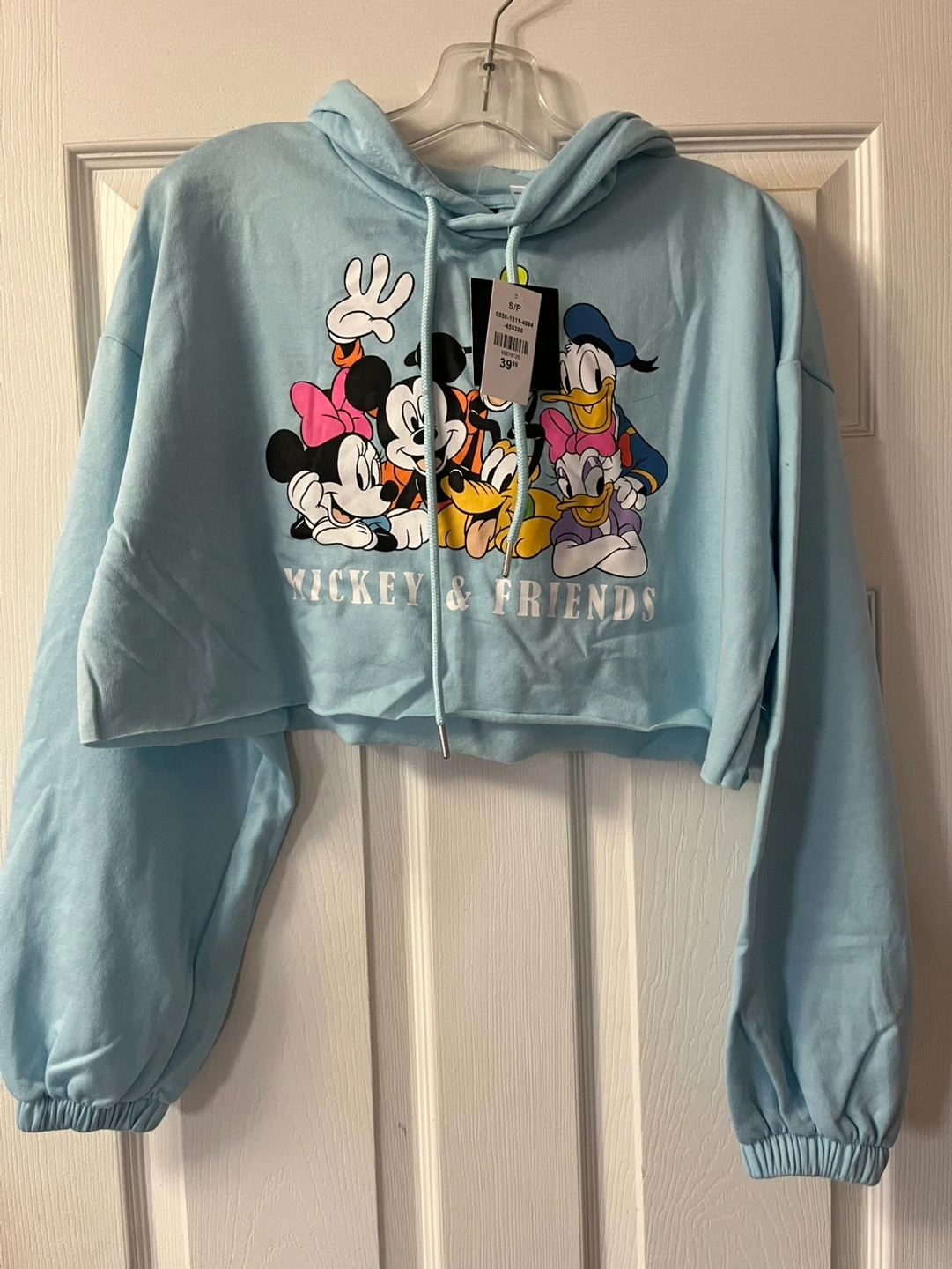 Blue cropped hoodie featuring Mickey Mouse and friends. Long sleeves with elastic cuffs. Drawstring hood. Fits like medium