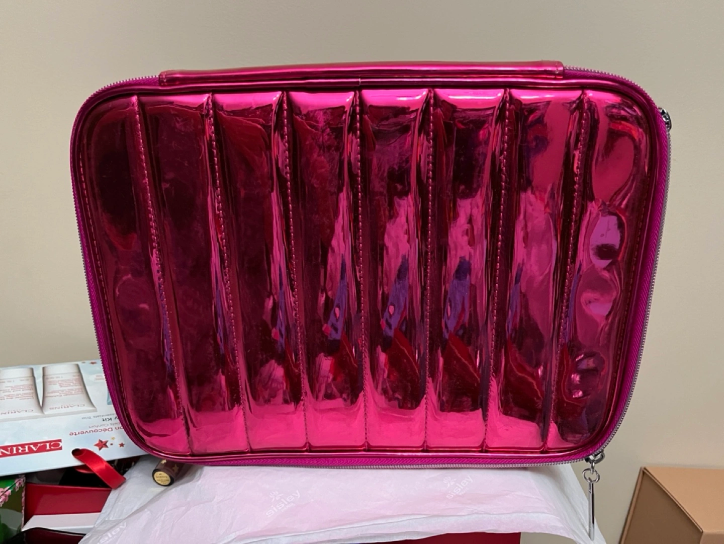 Pink makeup case with satin lining and a top handle. Zipper closure. Measures approximately 11 x 8 inches.