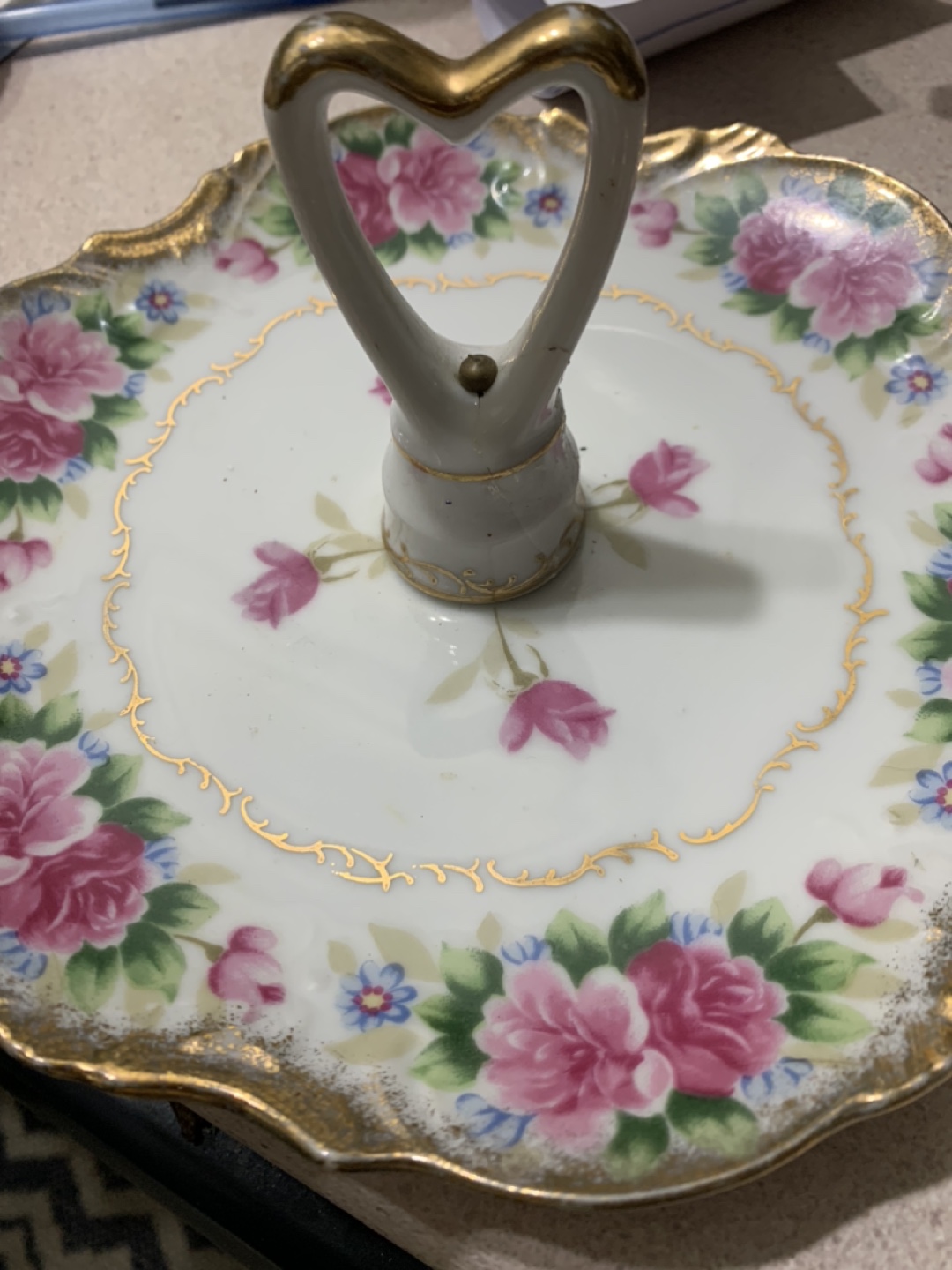 White porcelain serving plate with floral pattern, gold accents and heart-shaped handle. Titled garland rose 🌹 / The handle can be unscrued —