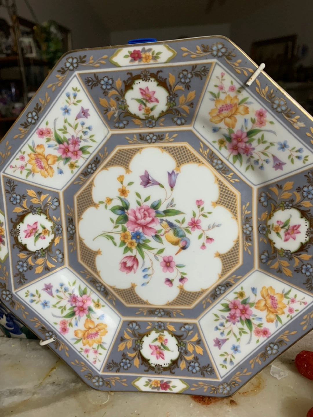 Octagonal plate with floral design and gold trim .. Imported and Sold by The BAY Department Store / Origin unknown - The Bay sticker still showing — Can’t deliver 😞