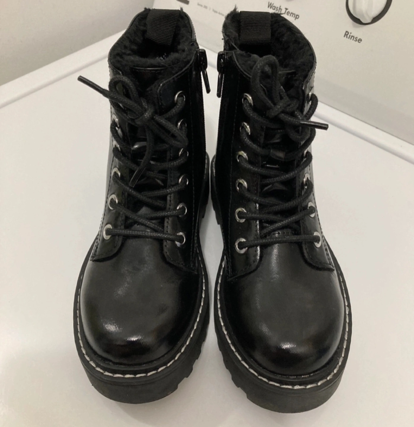 1000+Black faux leather boots with lace-up closure and side zipper. Features a white stitch detail around the sole. Size 1 See my original post for more details: https://ca.karrotmarket.com/buy-sell/698712