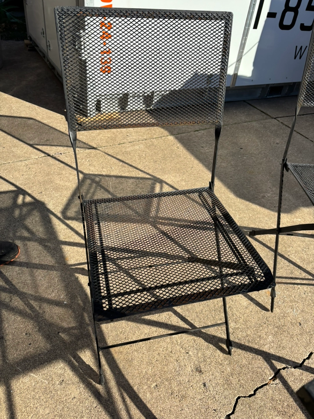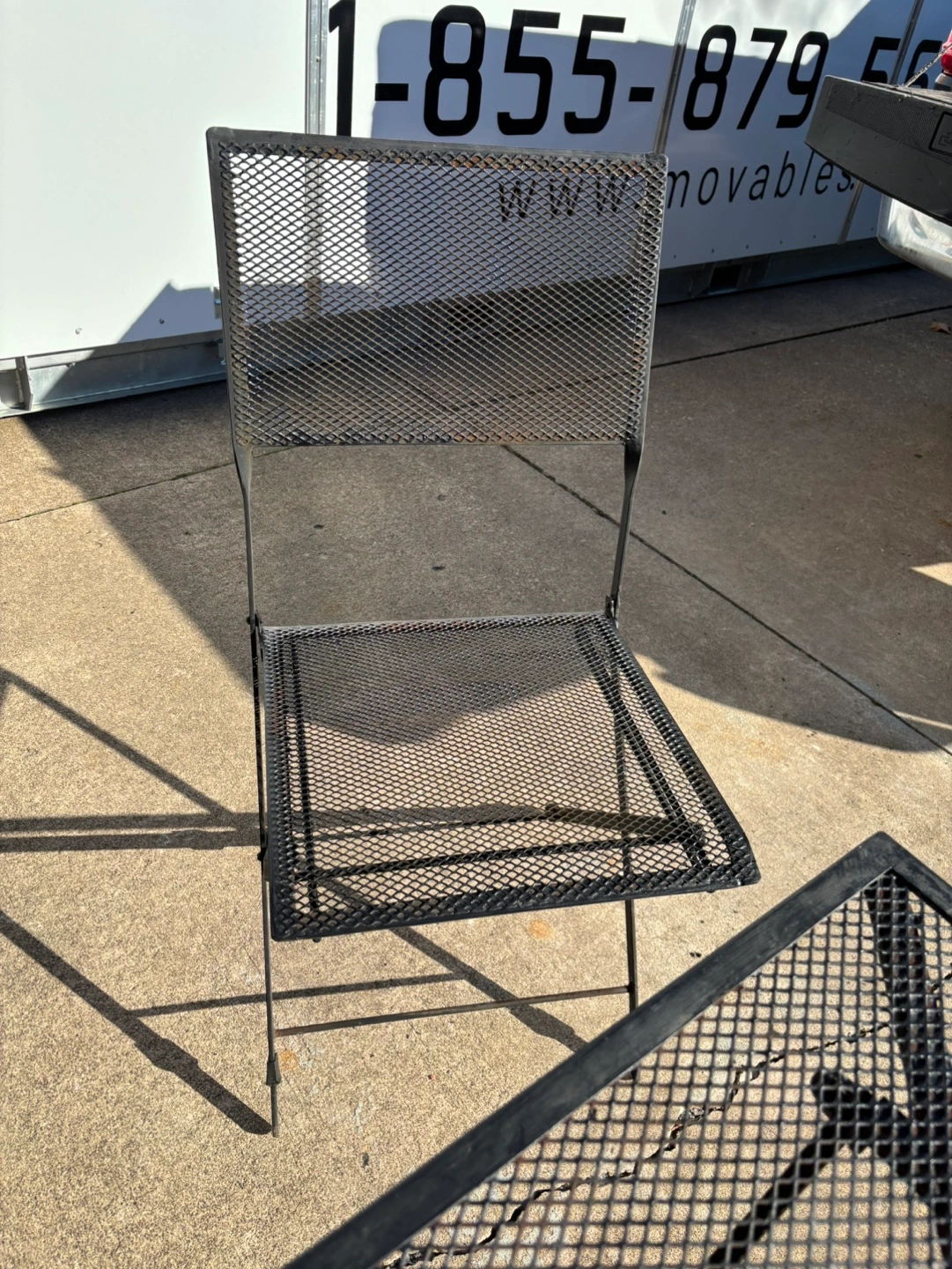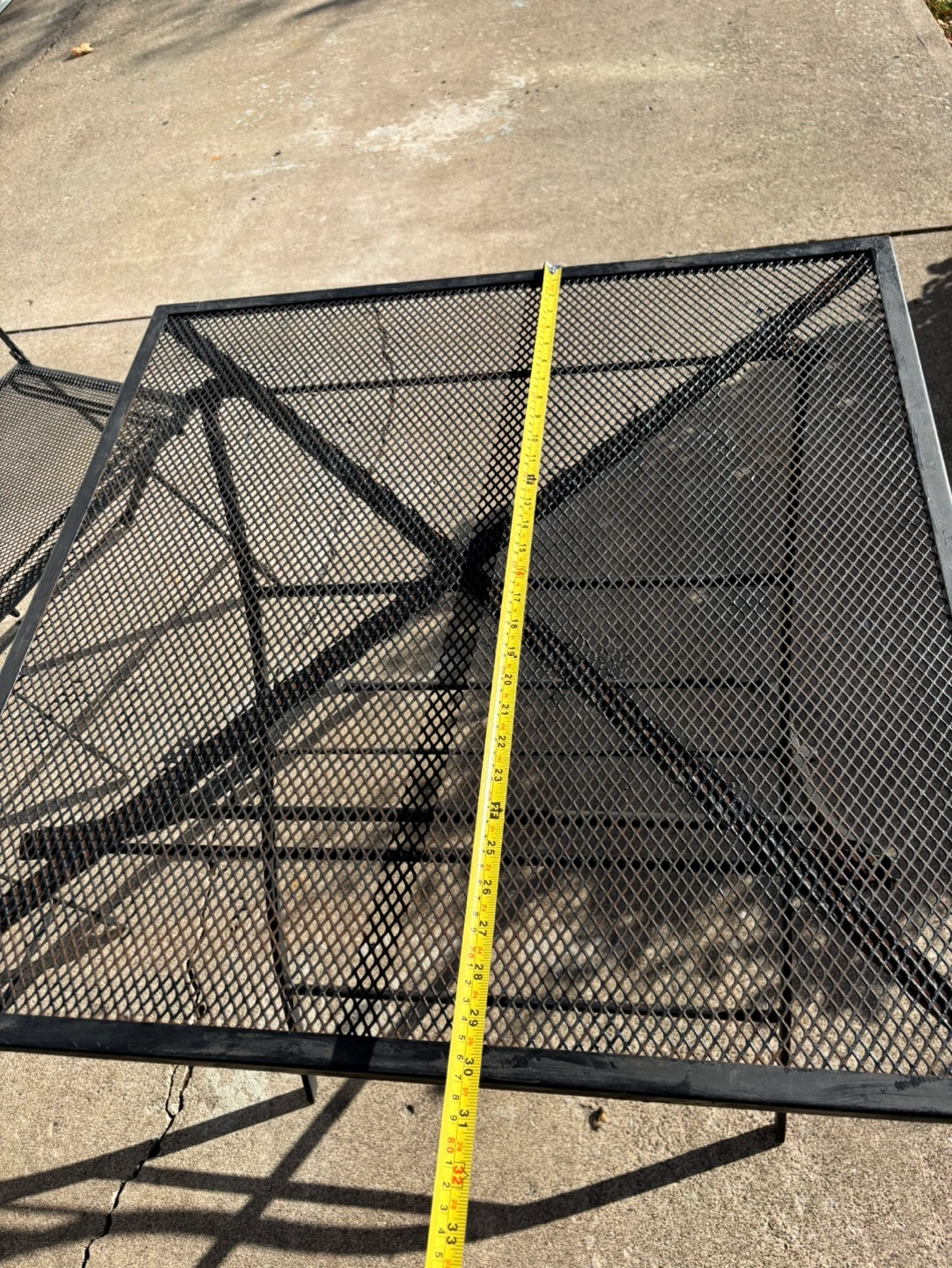 Metal patio set with table and two chairs. Table and chairs fold for easy storage. Just needs a little paint