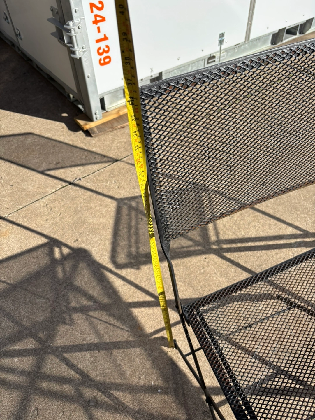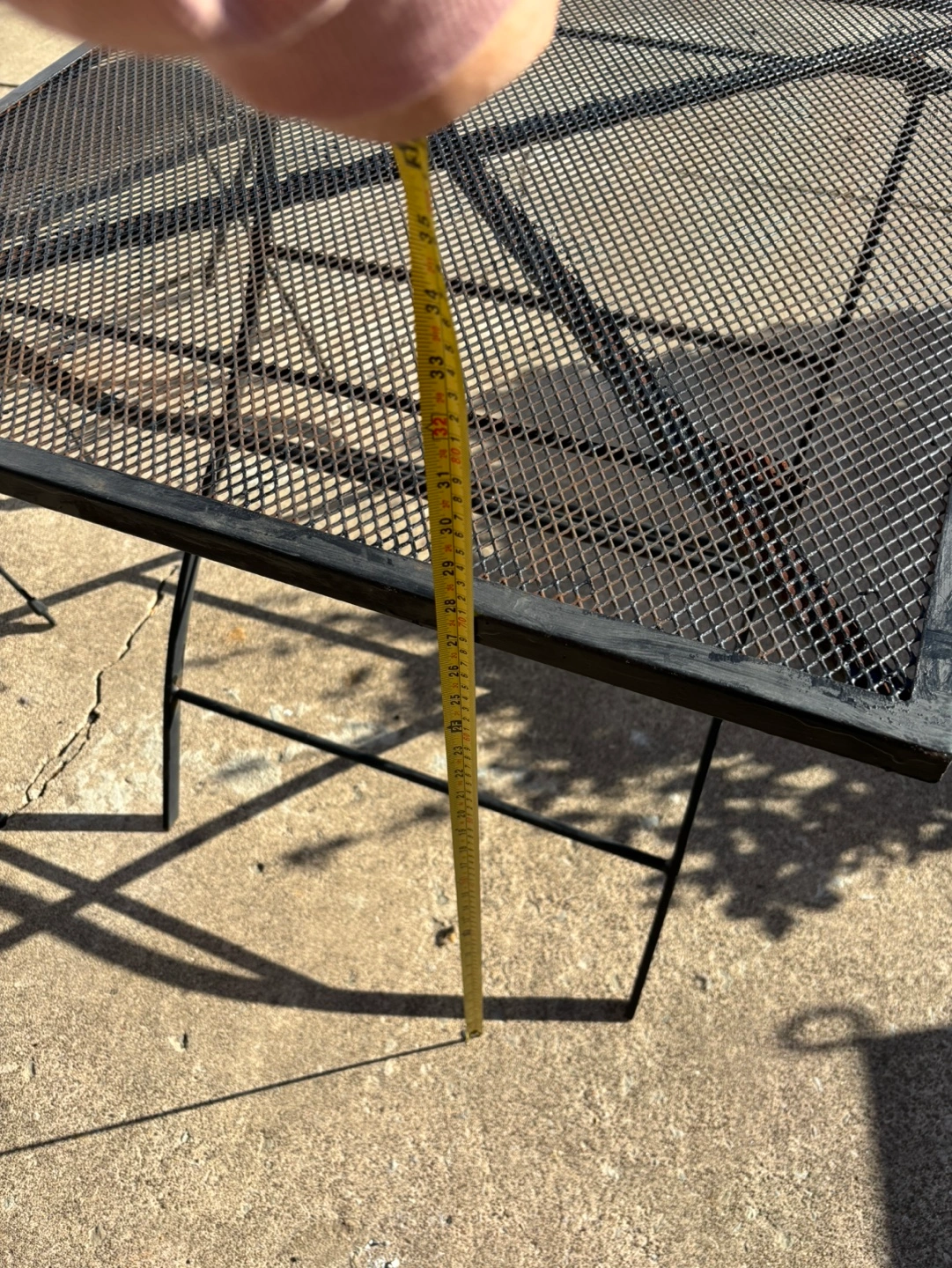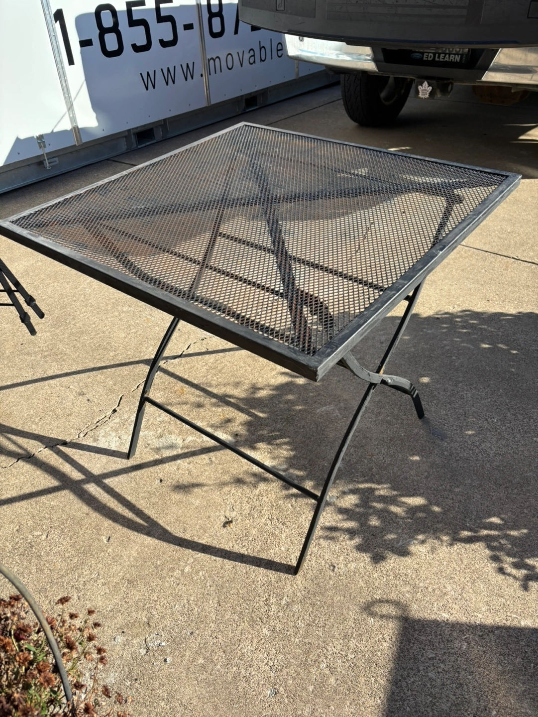 Metal patio set with table and two chairs. Table and chairs fold for easy storage. Just needs a little paint