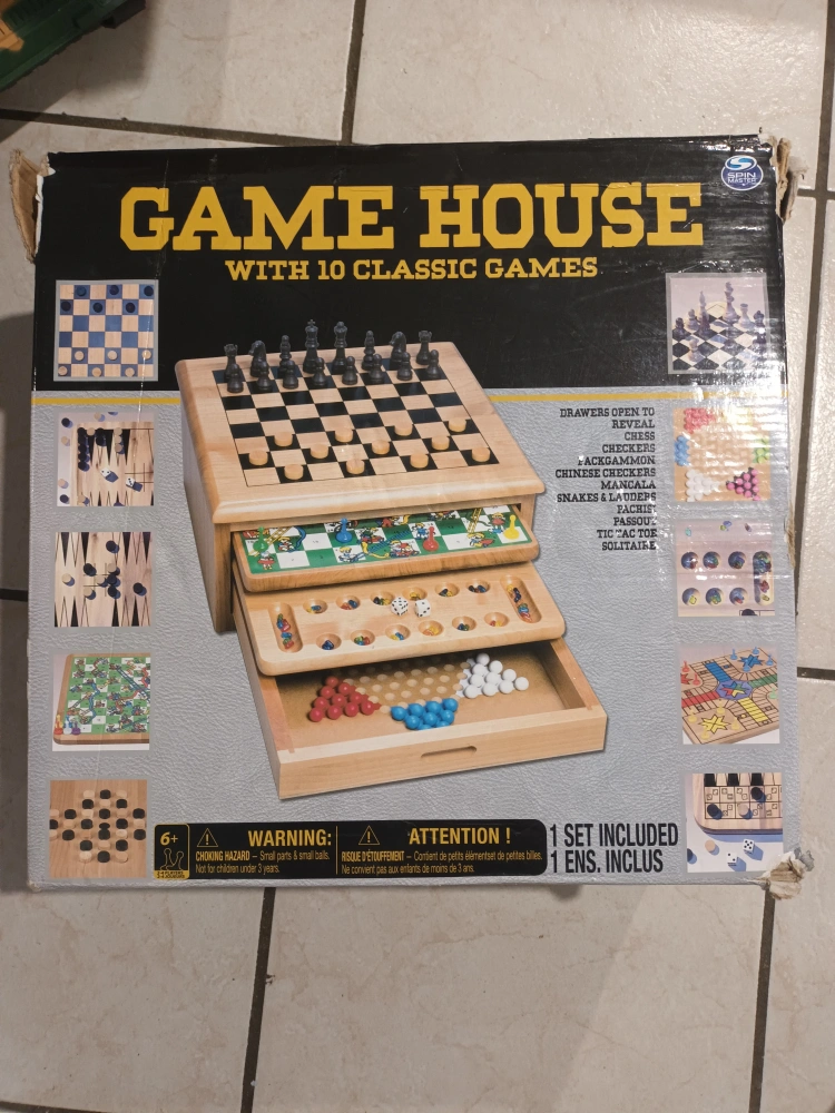 Game set with 10 classic games, including checkers, chess, Chinese checkers, and more. Games are stored in a wooden cabinet with pull out drawers. Few pieces may be missing.