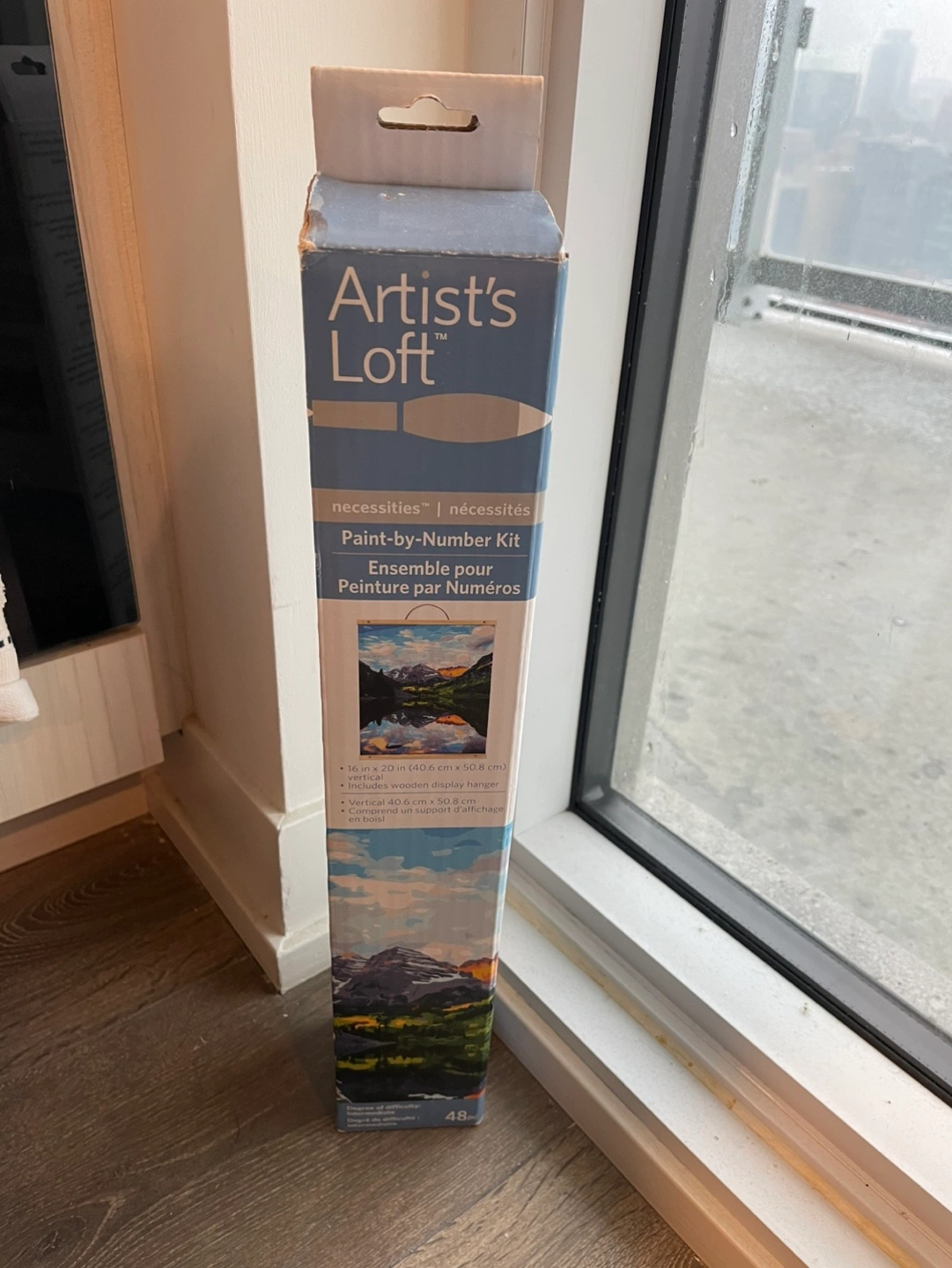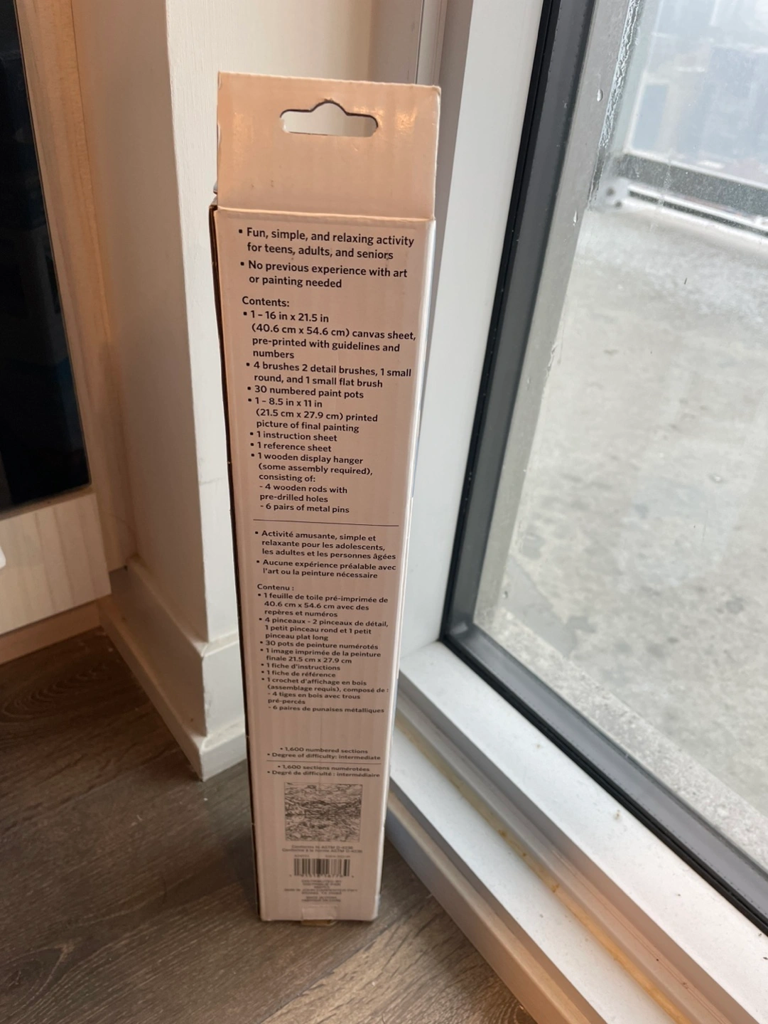 Paint-by-number kit, includes brushes, paints, canvas, and instructions. Pre-drilled holes for hanging.