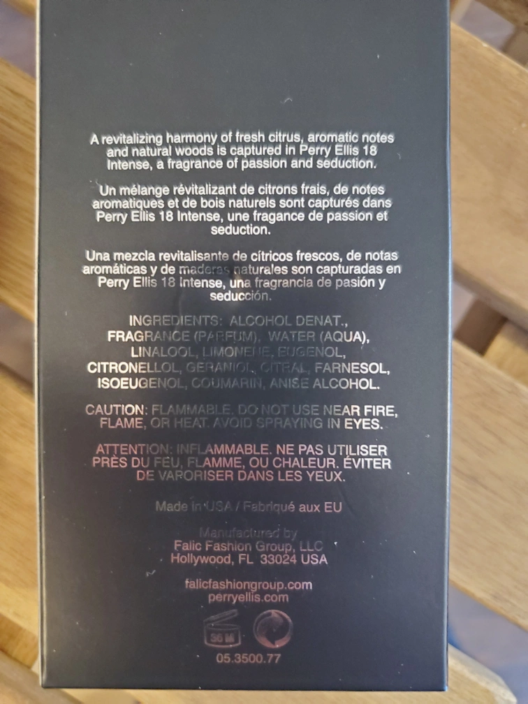 "a revitalizing Harmony of fresh citrus, aromatic notes and natural Woods is captured in Perry Ellis 18 intense, a fragrance of passion and seduction."