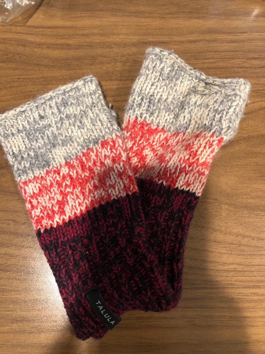 Striped fingerless gloves. Grey, pink and burgundy. Used a lot. May need cleaning.