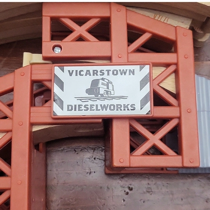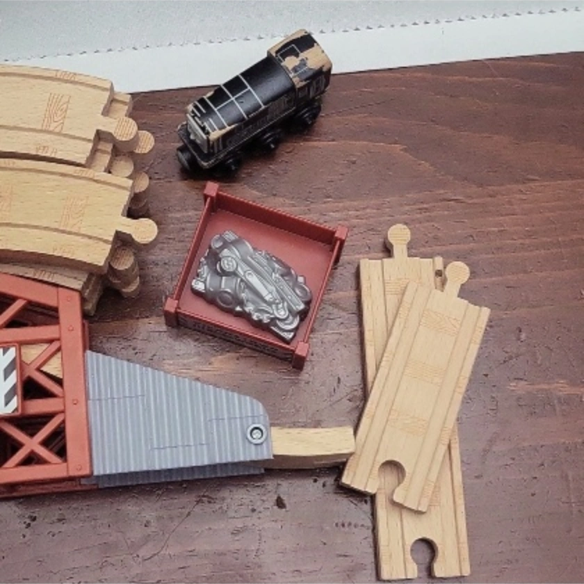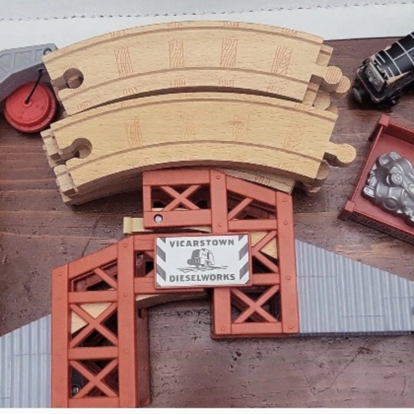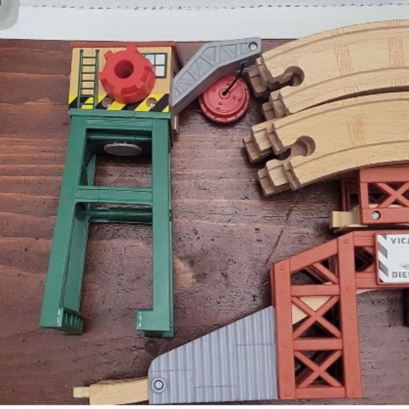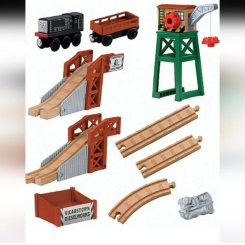 Wooden Railway track set includes a diesel engine, flatbed car, bridge, tower, and more.. Great condition, Diesel has seen better days, but he still much runs the show π