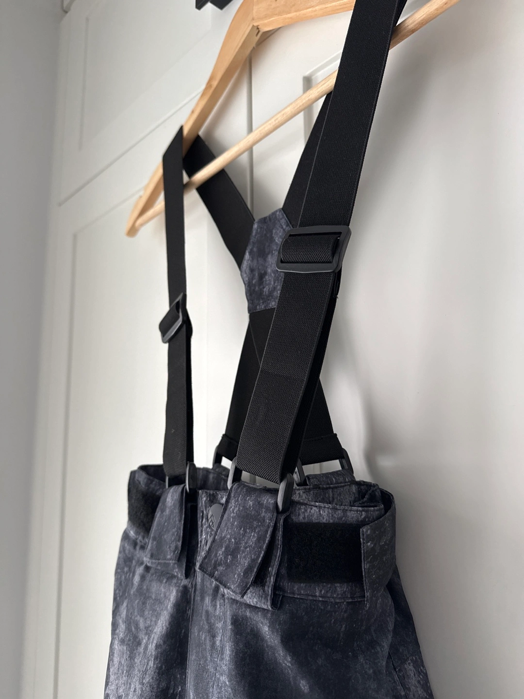 Black ski pants with removable suspenders and adjustable waist. Size XS/TP, 8 yrs.