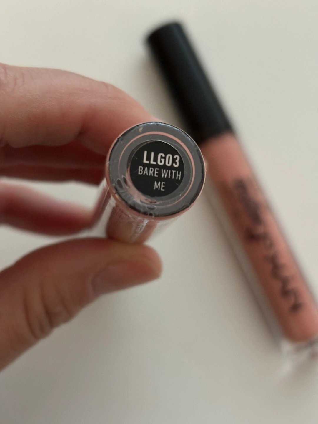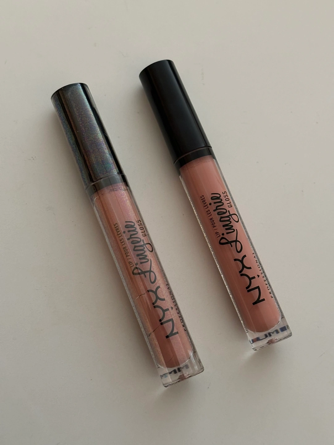 Two NYX Lip Lingerie lip glosses. One is sealed and the other has been swatched once with a Q tip. Both are the Bear with me shade.