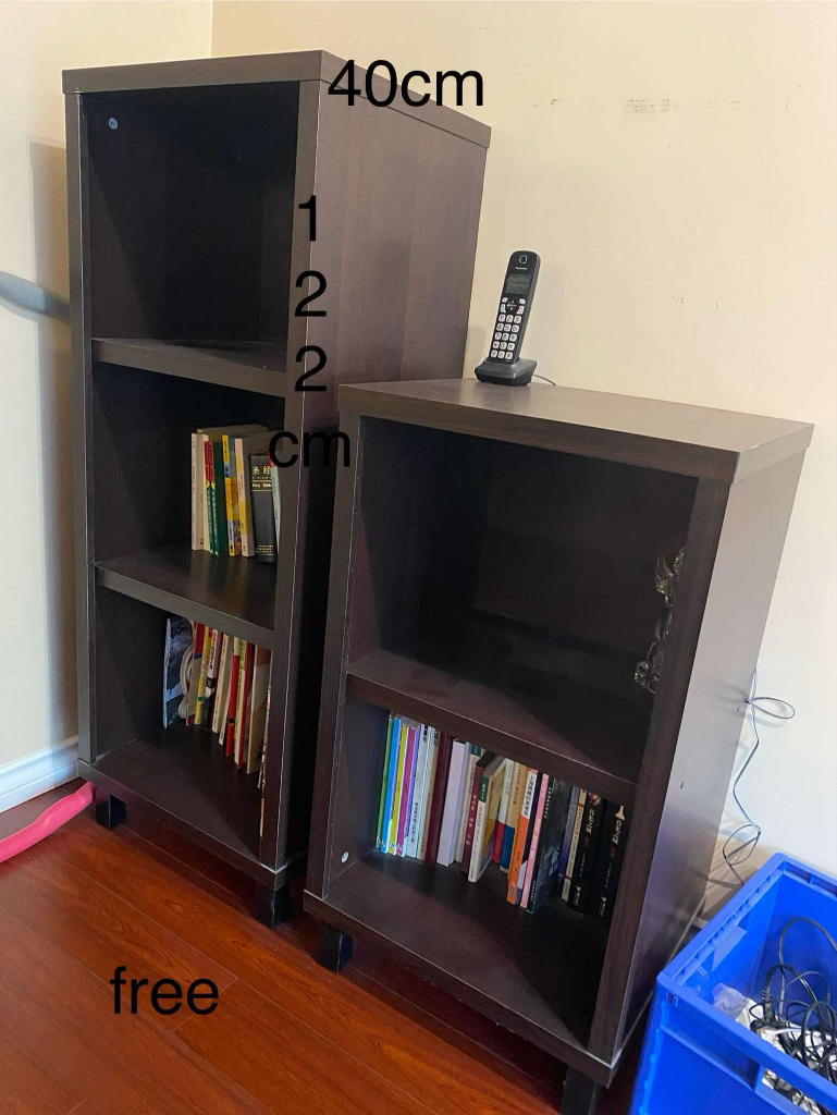 Two brown bookcases, both with three shelves, each shelf about 12 cm tall and 40 cm wide. The shelves are about 32 cm deep.