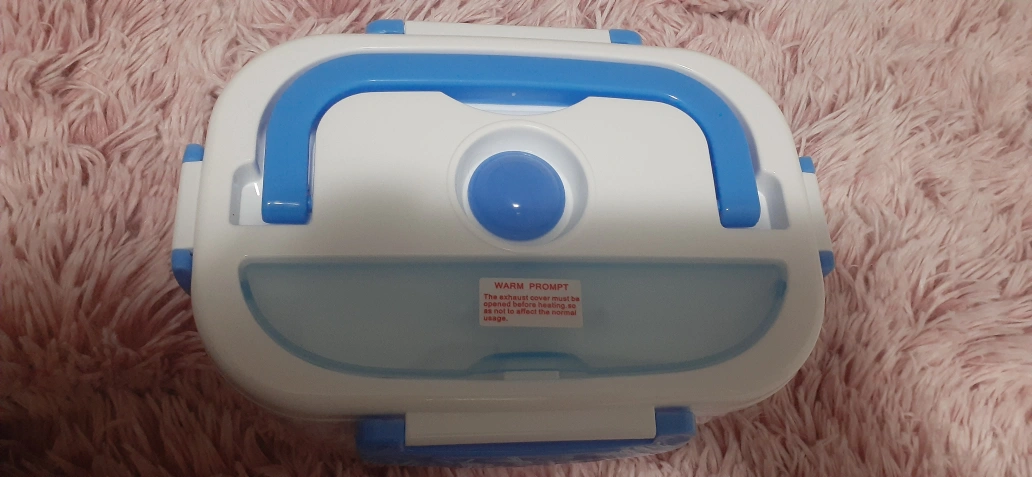 Electric lunch box with blue accents. Heats up food within 5 minutes.