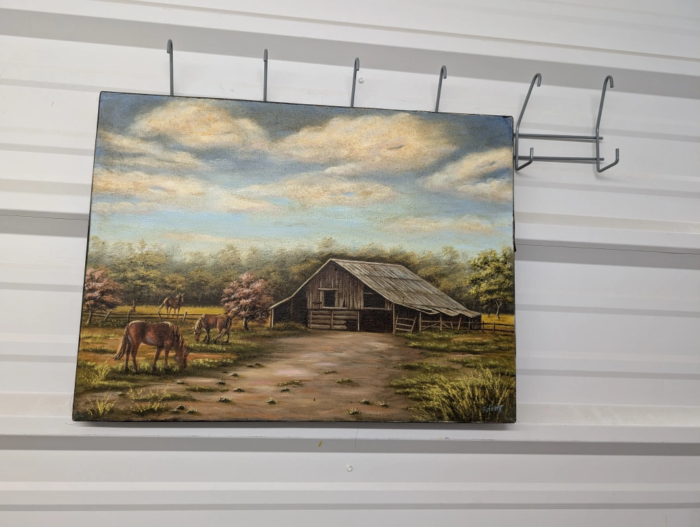 130Original oil painting depicting a country barn with horses grazing in the field. Signed by the artist.