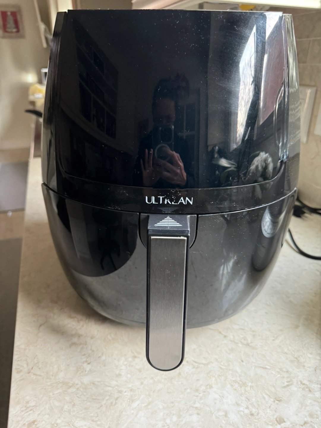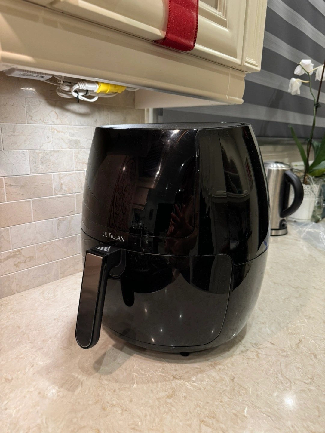 94Black air fryer. Includes a removable basket and a non-stick cooking pan.