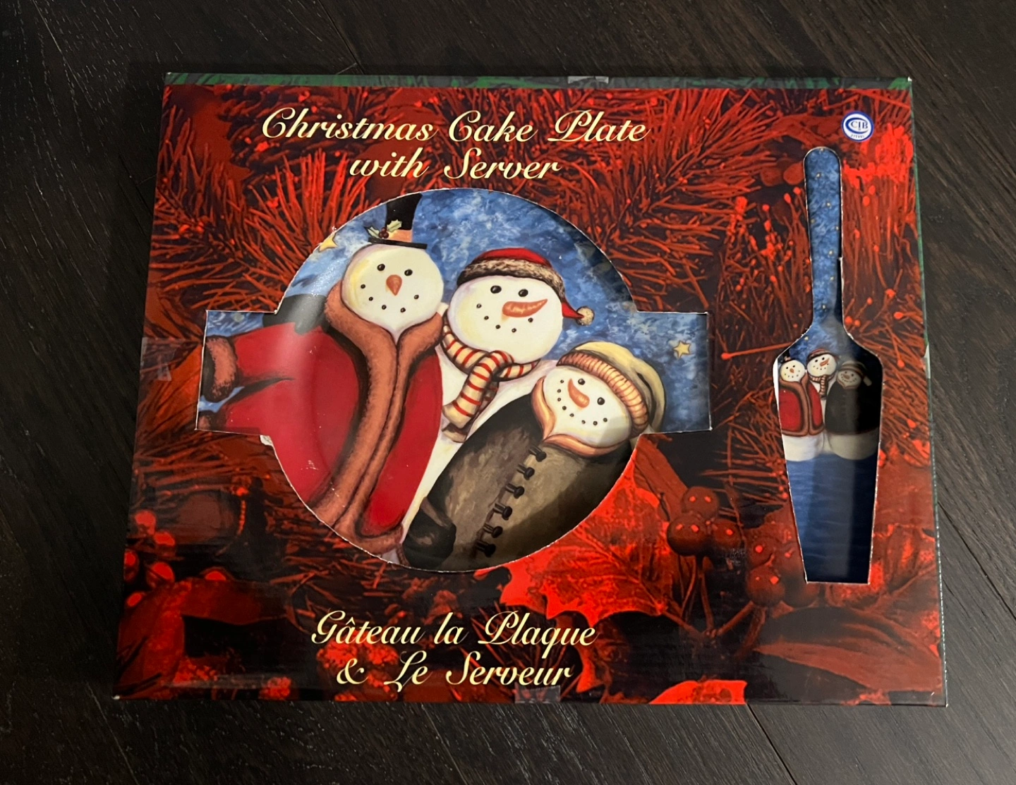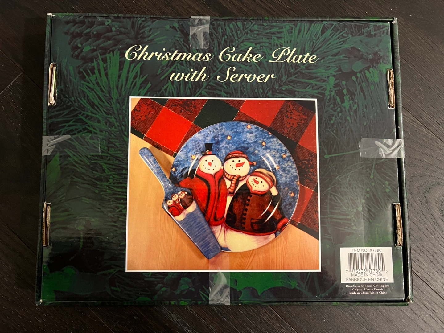 Snowman design. Includes cake plate and server. New in box. Box has never been opened.
