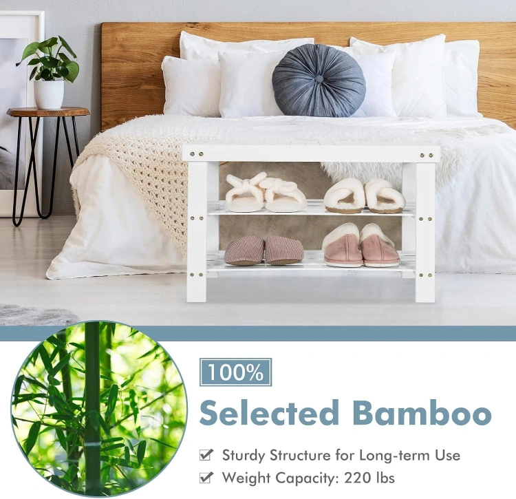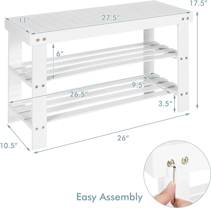 White Bamboo shoe rack with a built-in bench. 3 shelves provide storage for up to 6 pairs of shoes. Features slatted shelves for ventilation and raised legs for stability. Easy to assemble.