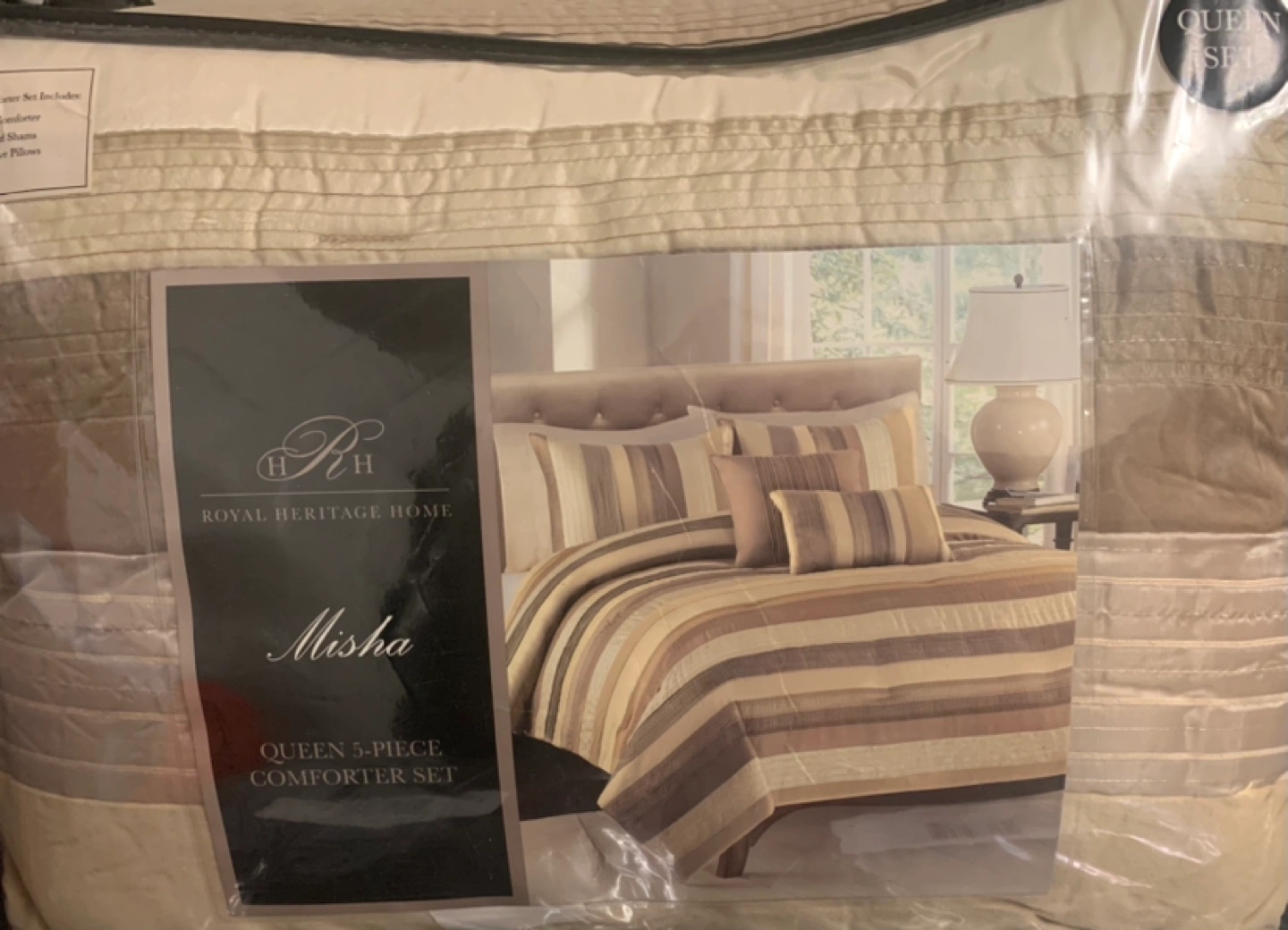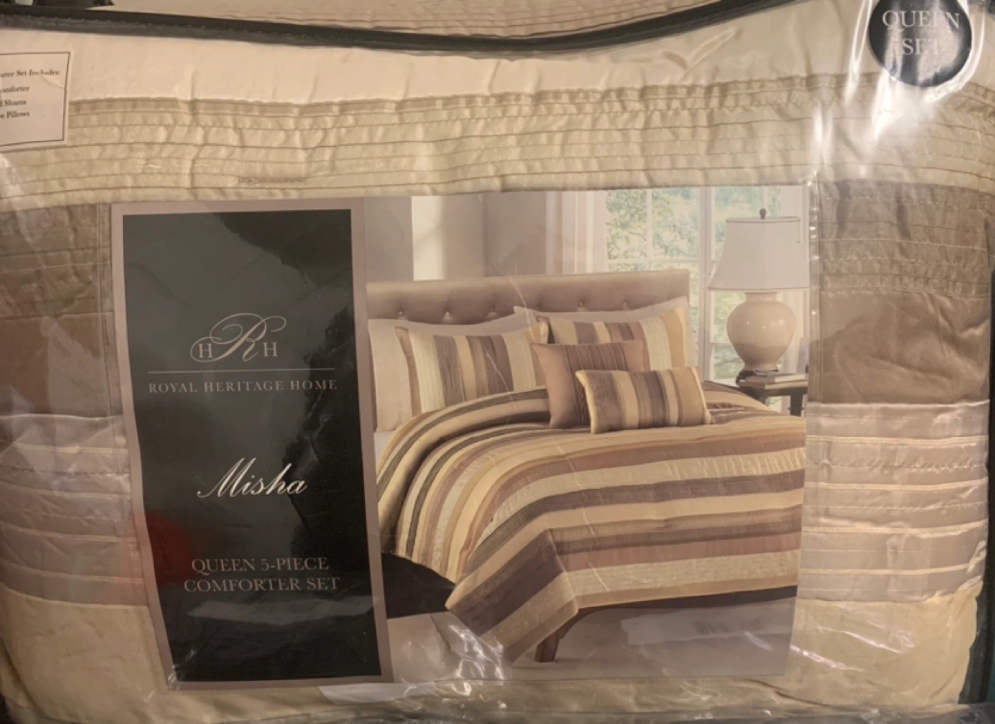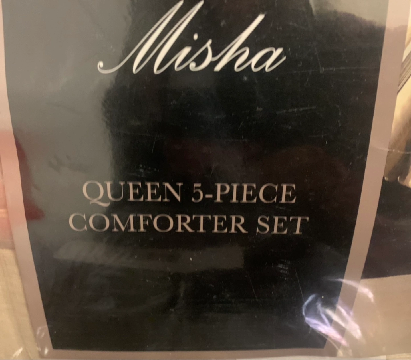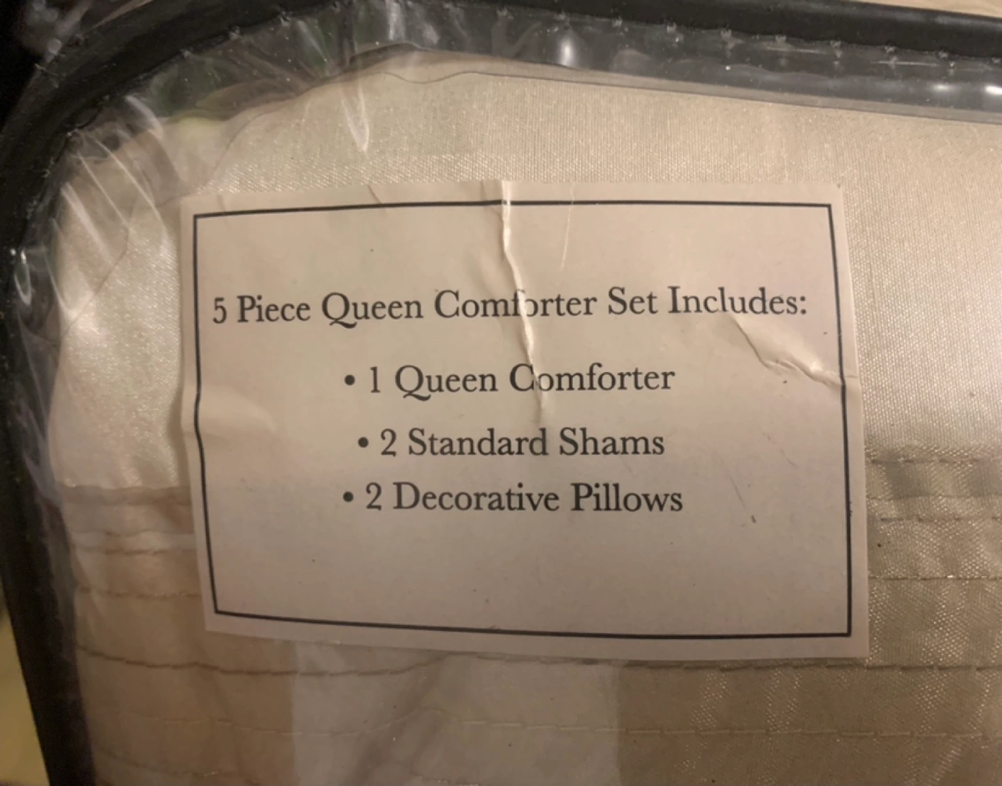Queen size comforter set. Includes a comforter, two standard shams, and two decorative pillows.