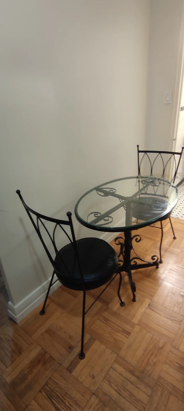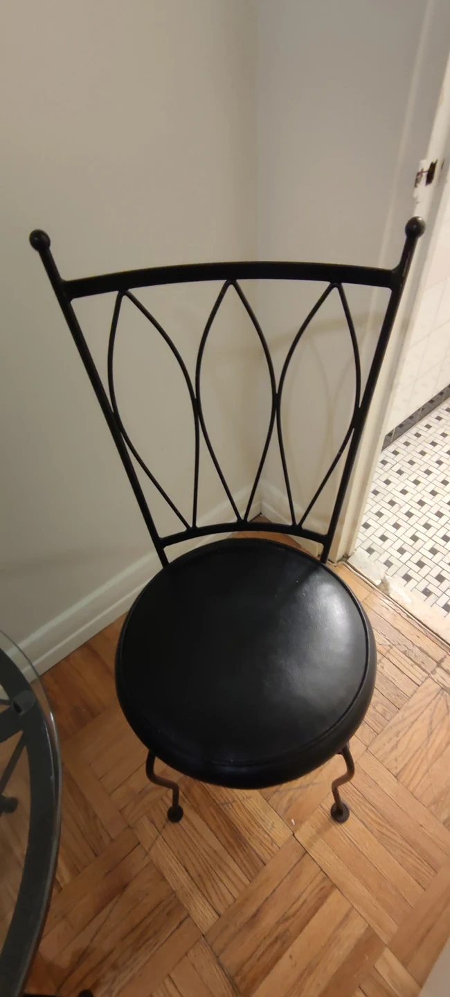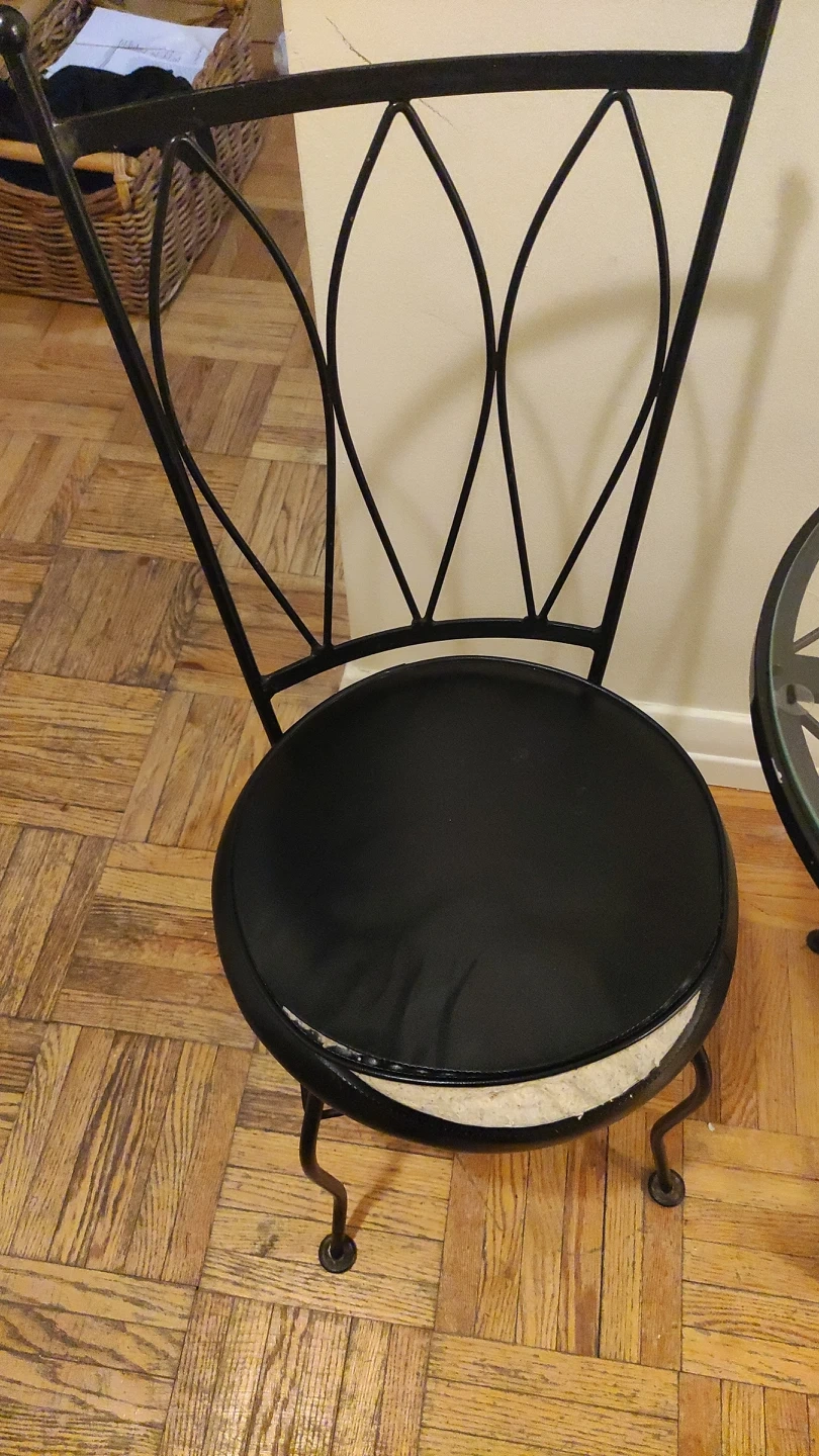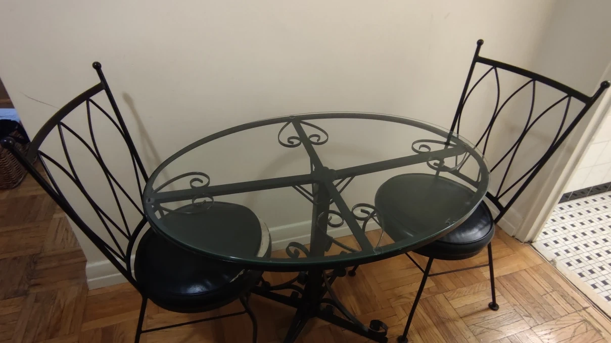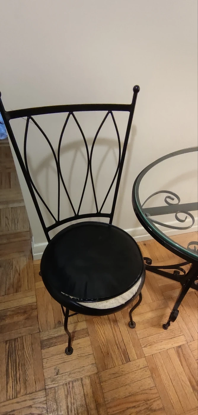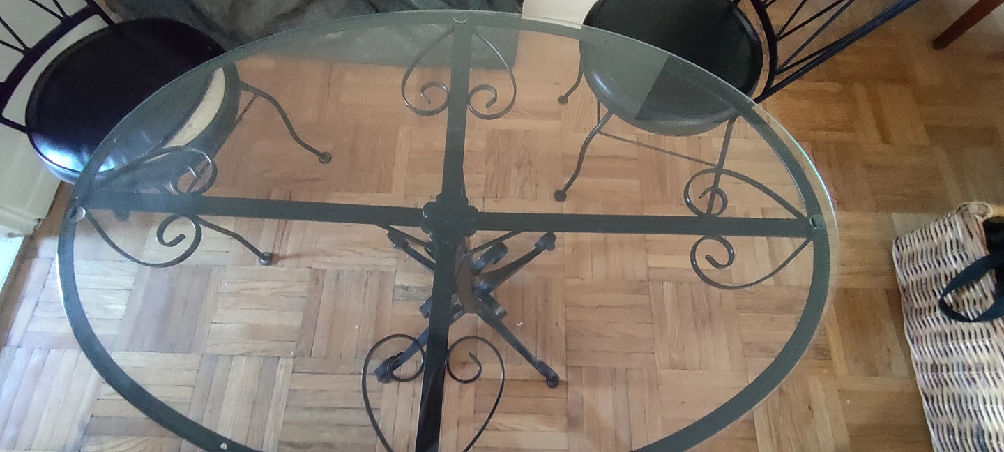 Leaving the country in a couple days. MUST BE PICKED UP TODAY, TOMORROW or SATURDAY MORNING!!! Rare, early 1960's "Ice Cream Parlour Set".(Wrought iron and glass table with 2 chairs.) Ideal set for a small space. Glass was replaced a few years ago-(perfect condition.) Table in "like new" condition! One chair perfect, the other chair needs cushion repaired. Wish I could take it with me, but happy for someone to make use of this special set. Available for *PICK UP ONLY* at Mt. Pleasant and Eglinton. From a pet free and smoke free home. Thanks! ππΏππΎππ½