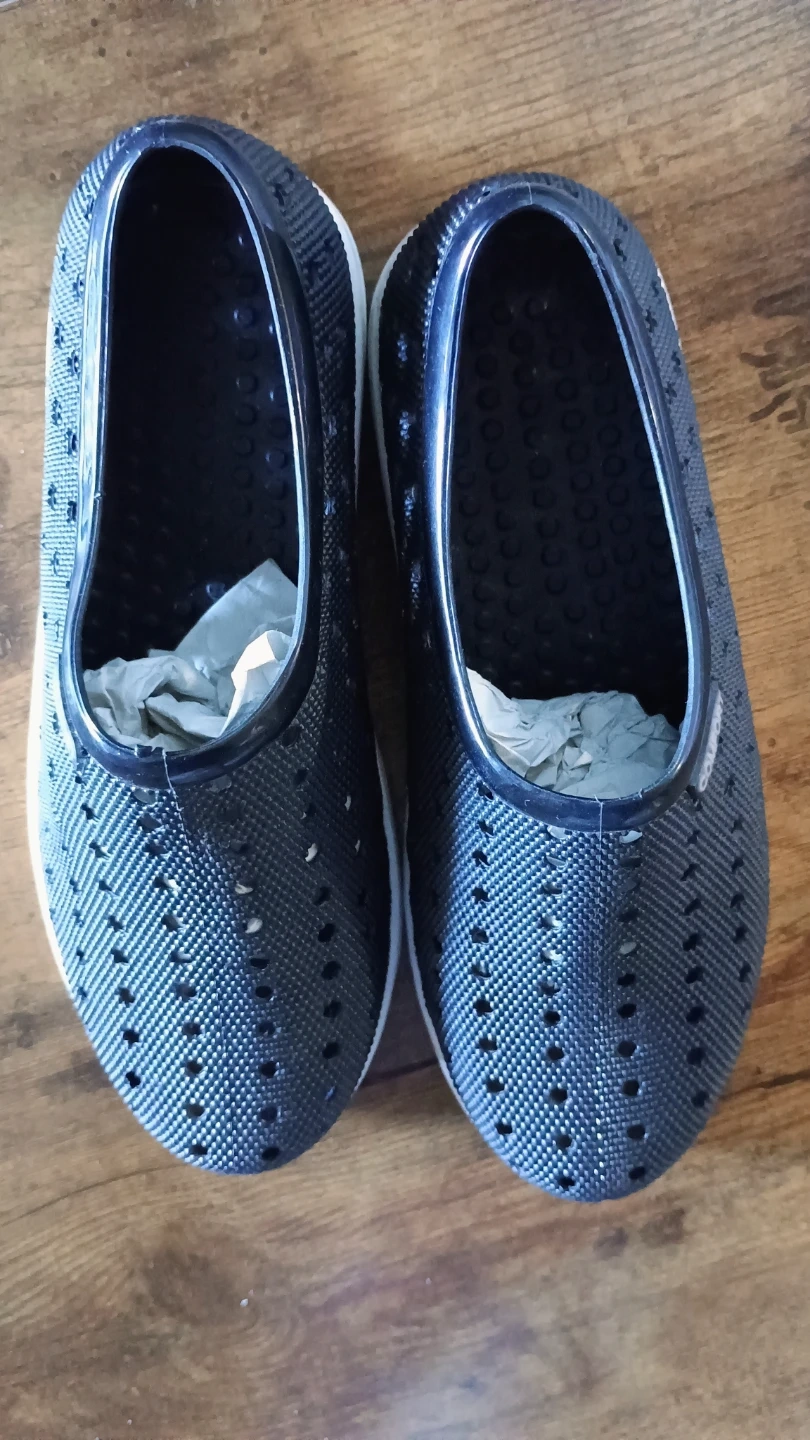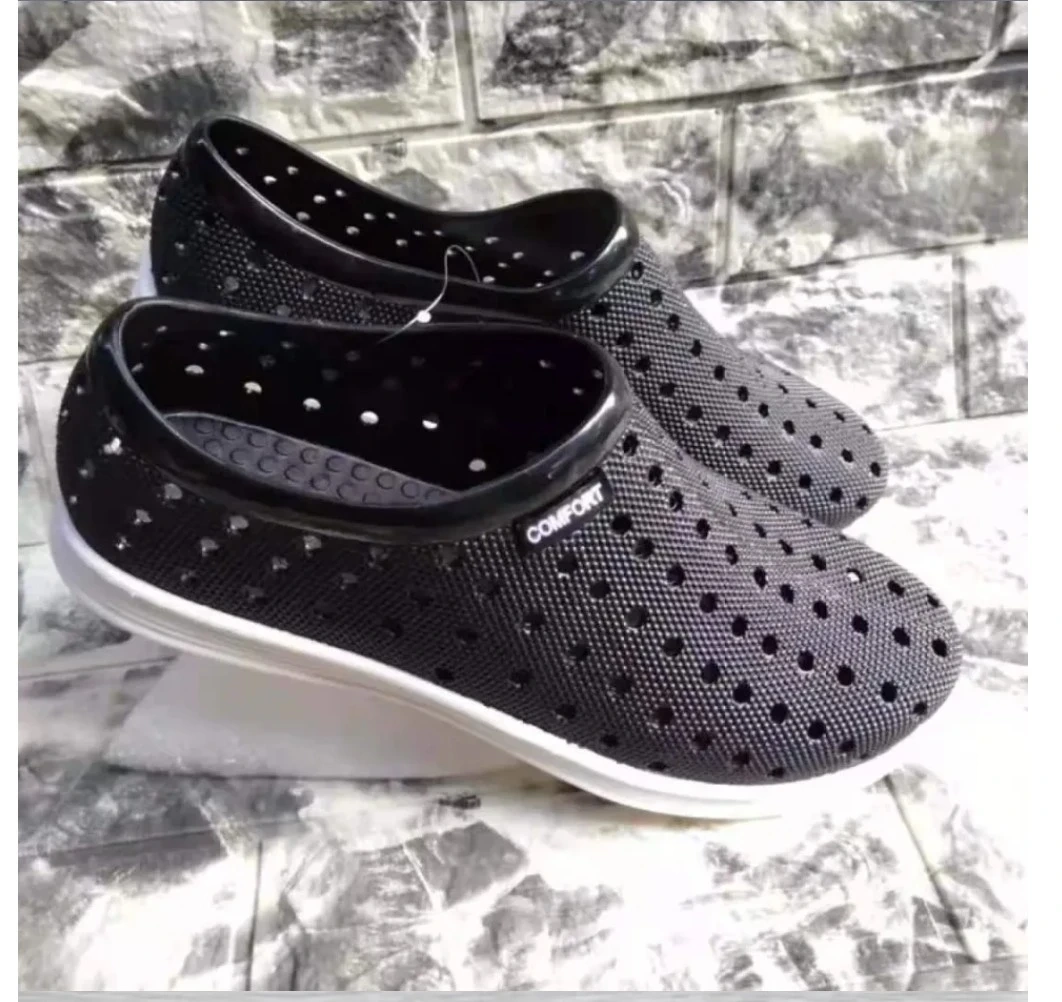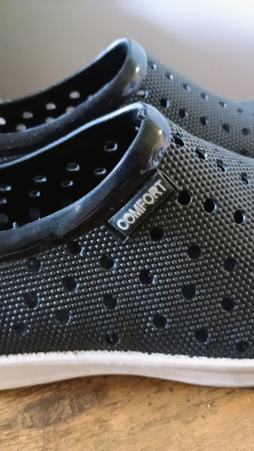 Comfort slip-on water shoes in black. These shoes are made of a flexible, perforated material, perfect for beach or water activities. Easy to clean and quick drying!