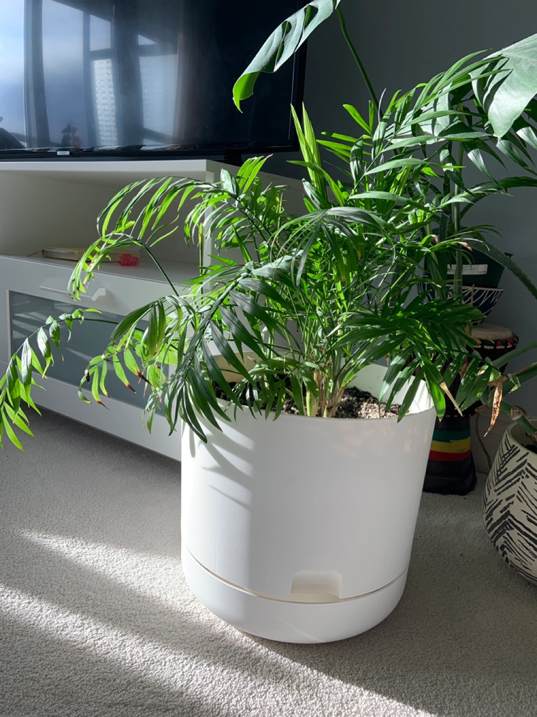Large Parlour Palm in white self watering pot. Includes a separate water reservoir. This is a low maintenance plant that can easily thrive in condos. I have cared for it lovingly but I’m moving so it has to go to another home.