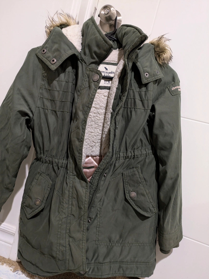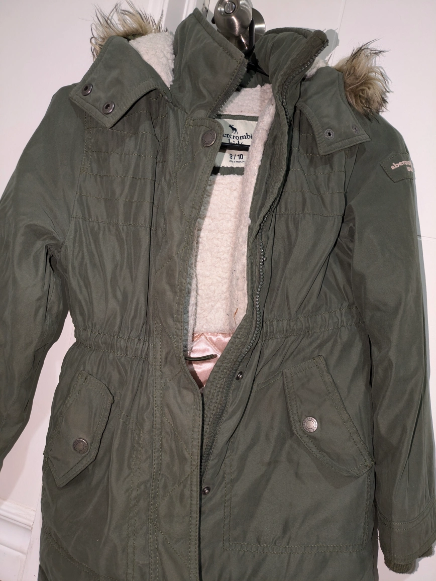 Green winter jacket with a faux fur hood. Size 9/10. Has a fleece lining. Drawstring waist and multiple pockets.