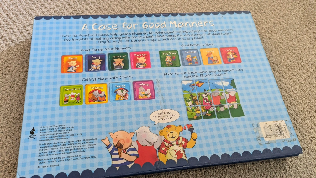 12 fun-filled books helping young children to understand the importance of good manners. The benefits of getting along with others and encourages the development of good habits. Helpful hints for parents and pages included in every book! Includes a 12-piece jigsaw!