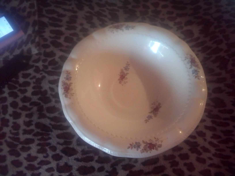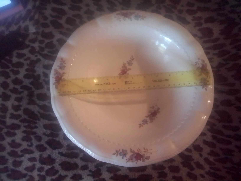 White serving bowl with floral design. Measures approximately 13 inches in diameter.