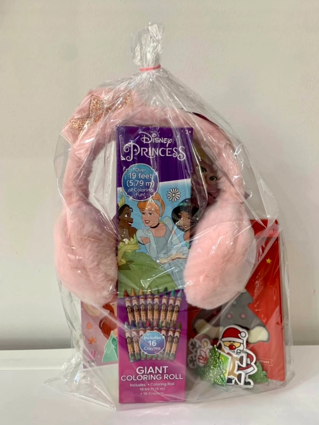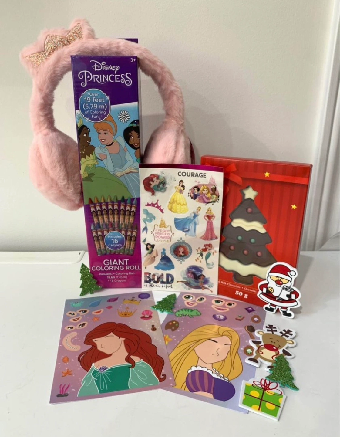 511Princess Fan Christmas Present - New. Wrapped and ready to gift. Includes: -Disney 19 foot GIANT colouring roll with 16 princess crayons -Princess earmuffs (with sparkly crown design) -Make a face stickers (Ariel and Rapunzel) -Disney Princess sticker sheet (Belle, Cinderella, Mulan, Ariel, Aurora, Merida, Jasmine, Tiana, Snow White) -Milk chocolate Christmas tree -Christmas themed foam stickers