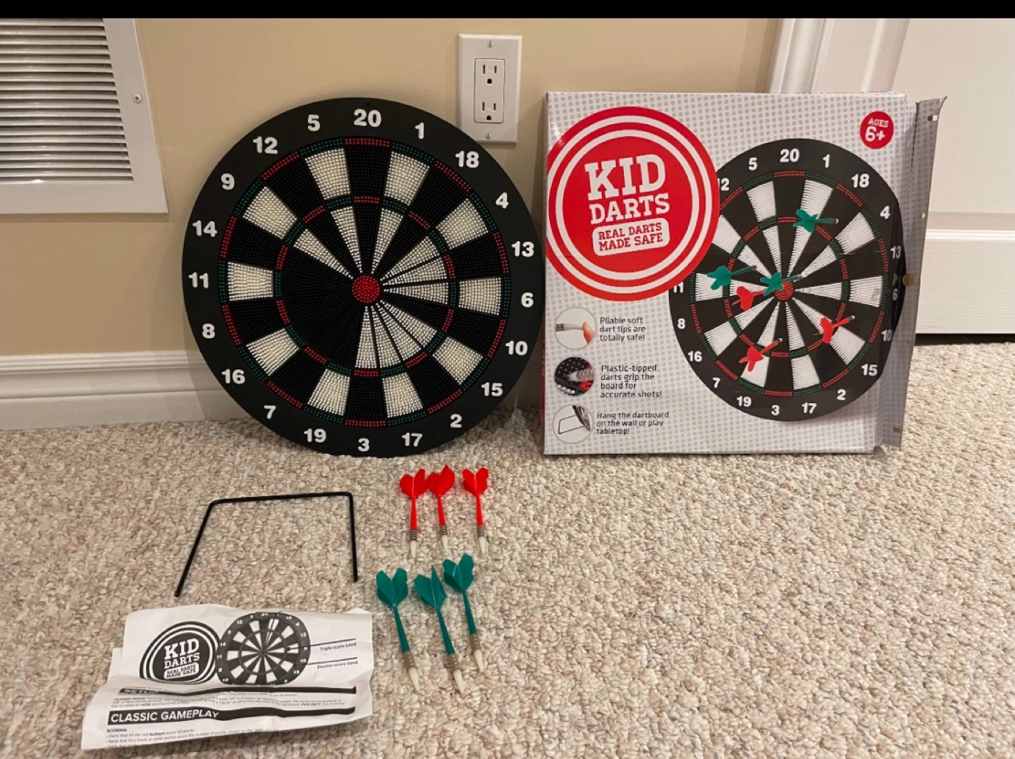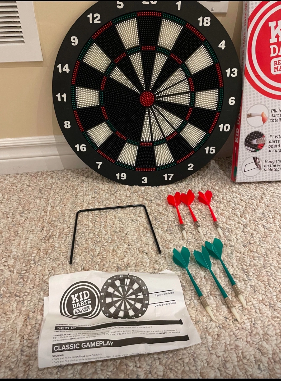 10Great condition Includes: 6 darts, with plastic tips Instructions Able to hang on the wall or stand on a table Pick up Bradford