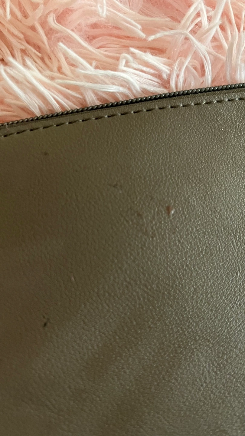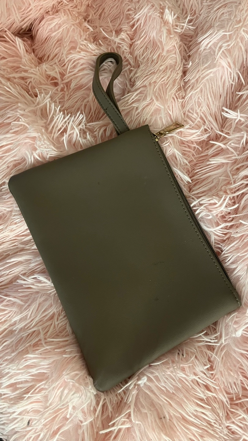 Small olive green clutch with a zipper closure and top handle. Signs of use (markings pictured above) but still in perfect working order. Zipper still works perfectly fine and itβs still useful (just not to me lol) so Iβm giving it away!